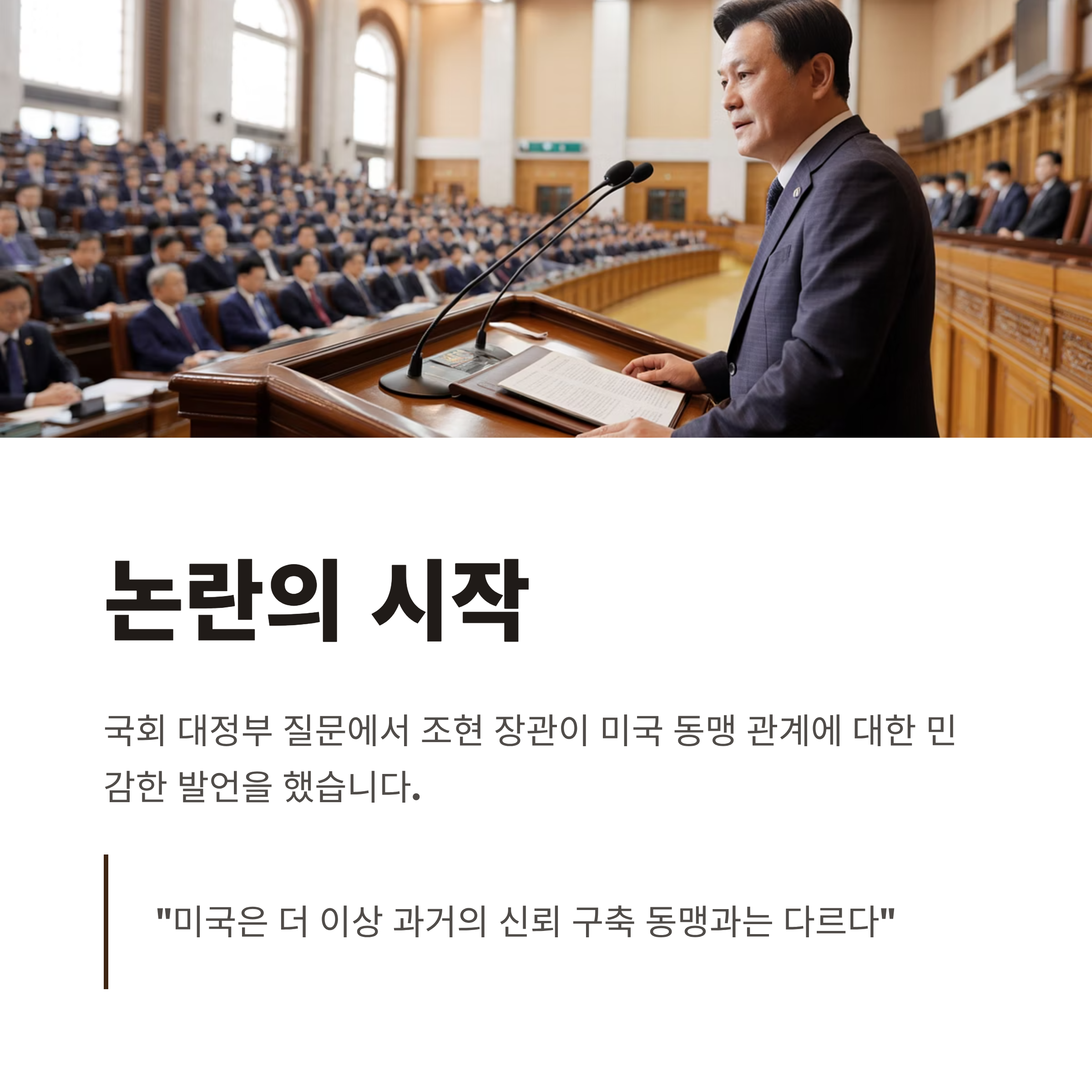 1. 조현 장관은 국회에서 미국의 동맹국 정책 변화와 국제 정세를 언급하며 "미국은 더 이상 과거와 다르다"고 발언했습니다.