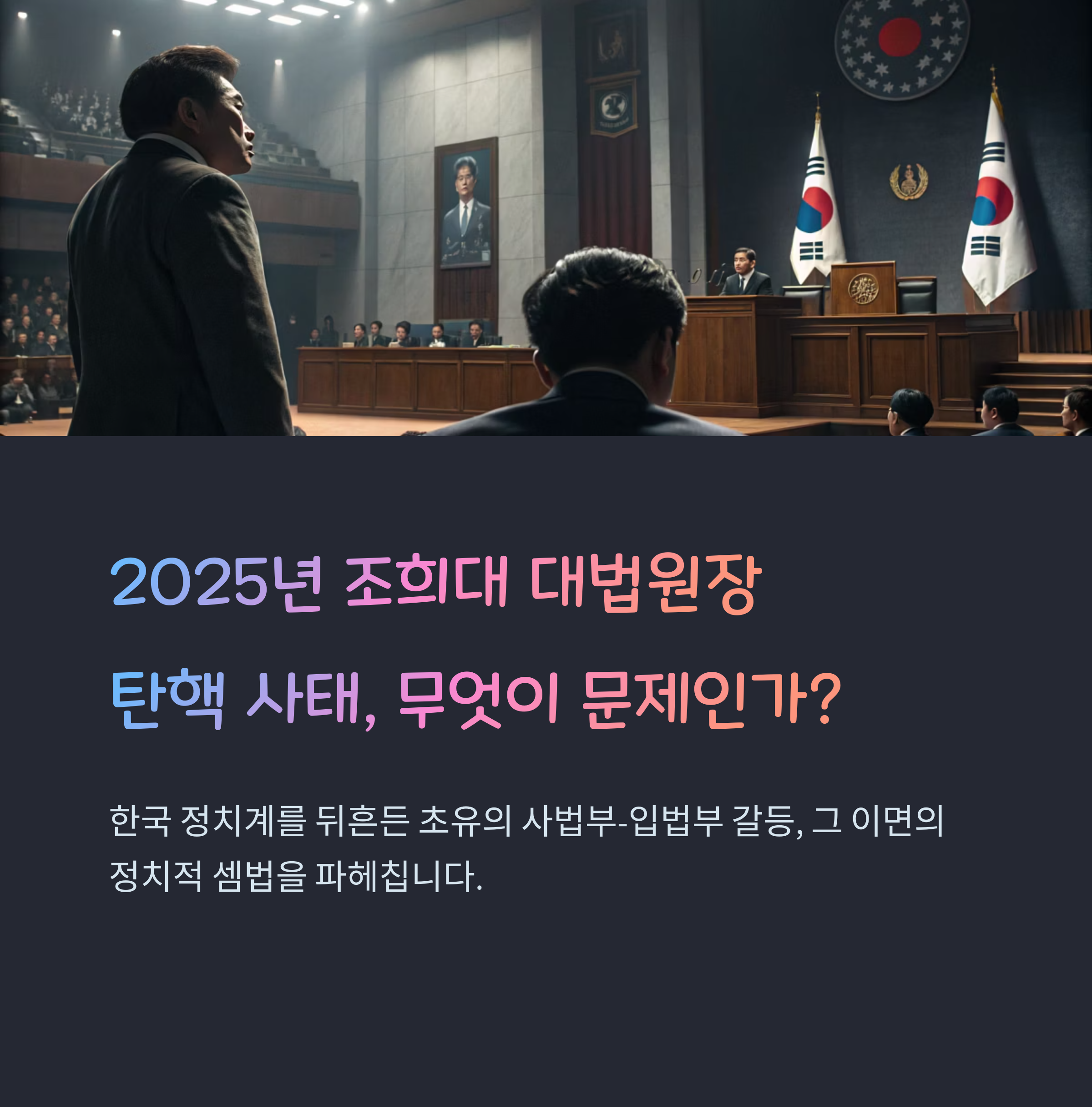 2025년, 민주당이 조희대 대법원장의 탄핵을 추진했다가 갑자기 보류한 사건은 단순한 정치 이슈를 넘어 한국 정치 전반에 깊은 파문을 일으켰습니다. 이재명 대표에 대한 대법원 판결을 둘러싼 사법 리스크 속에서, 민주당은 헌법기관인 사법부를 겨냥하며 탄핵이라는 초강수를 뒀습니다. 하지만 이내 전략을 수정하며 한 발 물러서는 선택을 했죠. 이 글에서는 탄핵 추진의 배경과 그 보류 결정에 담긴 정치적 셈법을 짚어봅니다.