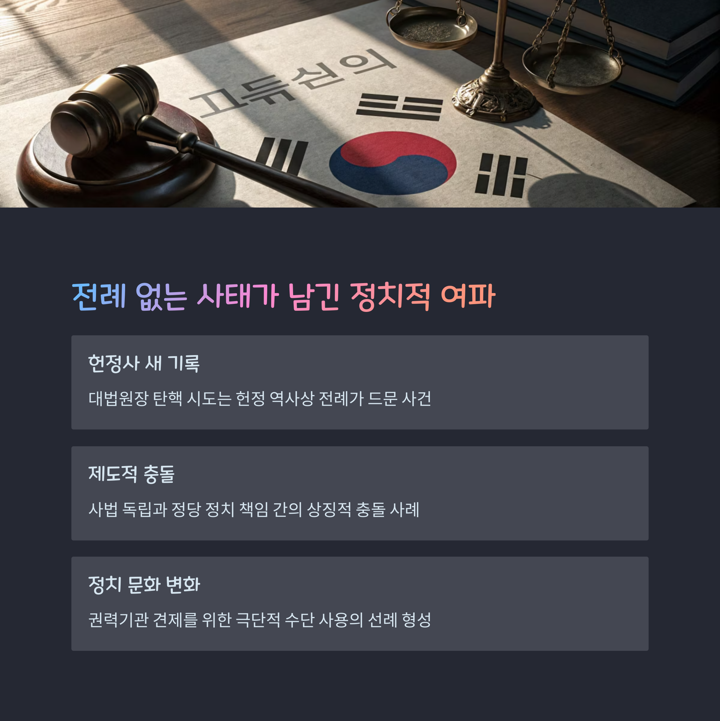 - 이번 사건은 사법 독립과 정당 책임의 충돌 사례로 기록될 가능성 높음