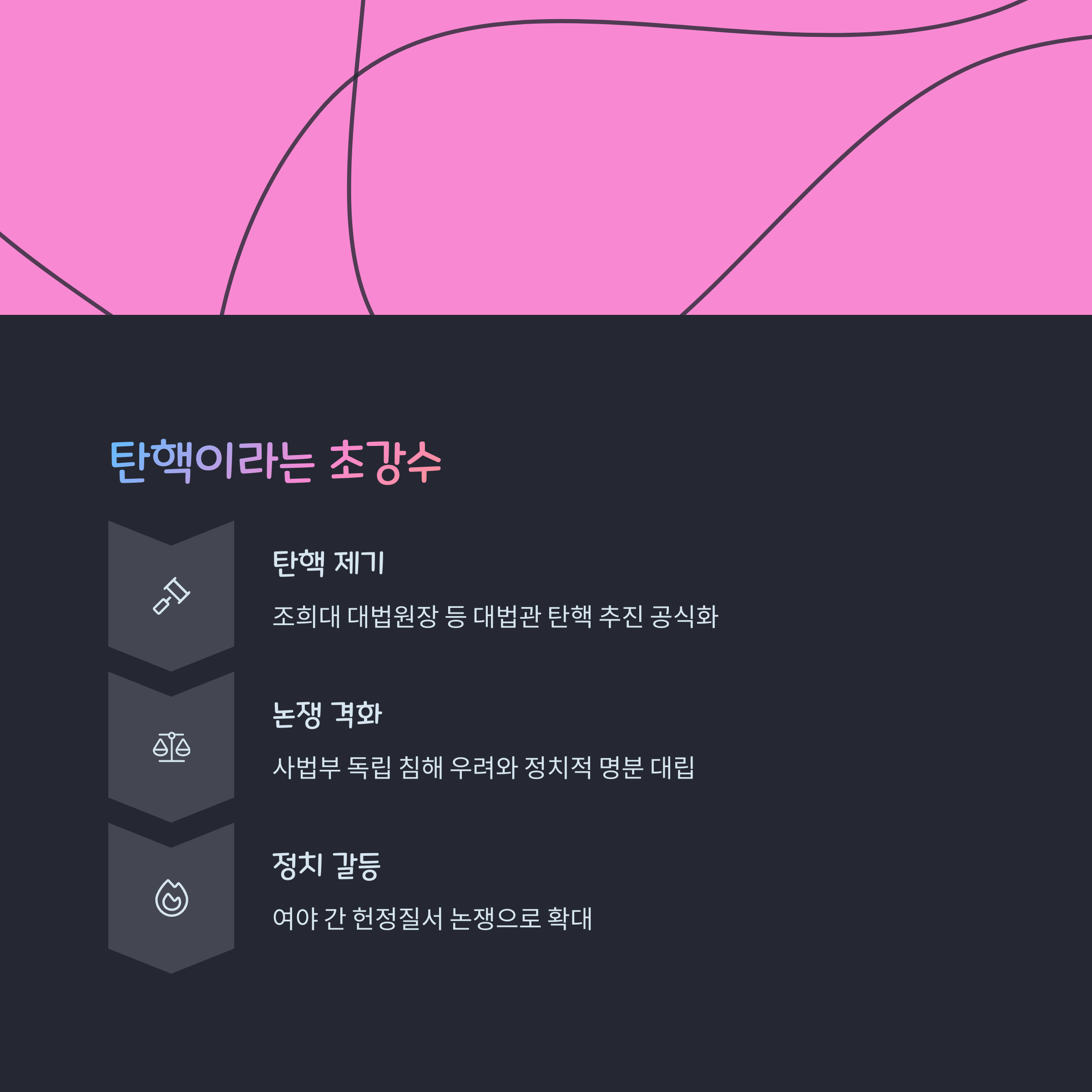탄핵 추진의 정치적 상징성은 컸지만, 헌법적 정당성은 부족했습니다. 조희대 대법원장은 명백한 위법 행위를 저지른 것이 아니라는 점에서 탄핵 사유로 부족하다는 지적이 나왔죠. 사법부의 판결에 대한 불만을 정치적 방식으로 대응하는 것은 헌법 정신에 반할 수 있다는 비판도 뒤따랐습니다. 민주당은 결국 정치적 상징보다 헌법적 책임에 무게를 두는 선택을 하게 된 것입니다.