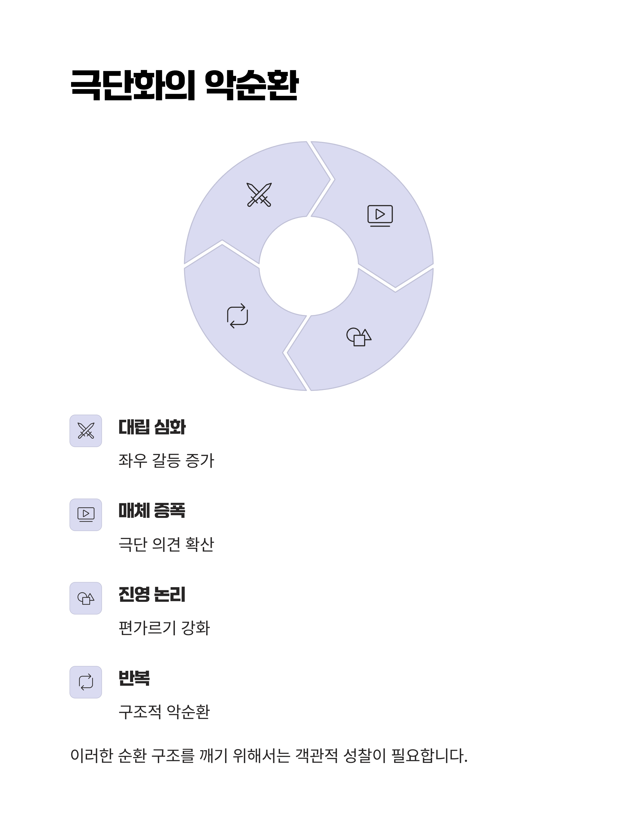대중매체와 소셜미디어는 좌우파의 상호왜곡과 극단적 사고를 촉진하는 주요 도구로 작용한다. 좌파 성향의 뉴스 소비자는 자신과 다른 입장을 가진 사람을 "반사회적"으로 바라보는 경향을 보이며, 우파는 좌파의 구조적 설득 방식을 "프레임화 전략"으로 규정한다. 여론은 이러한 혼란 속에서 중도가 아닌 극단적 성향을 더욱 선호하는 사회적 경향으로 이어지는 구조적 악순환을 보여준다.
