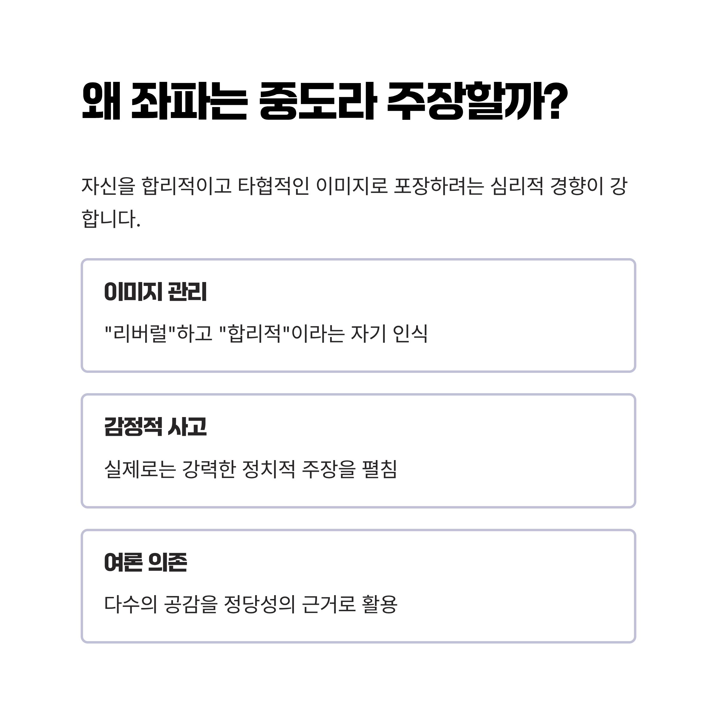 좌파가 중도라고 주장하는 주요 원인은 감정적 사고와 여론 의존 때문입니다.