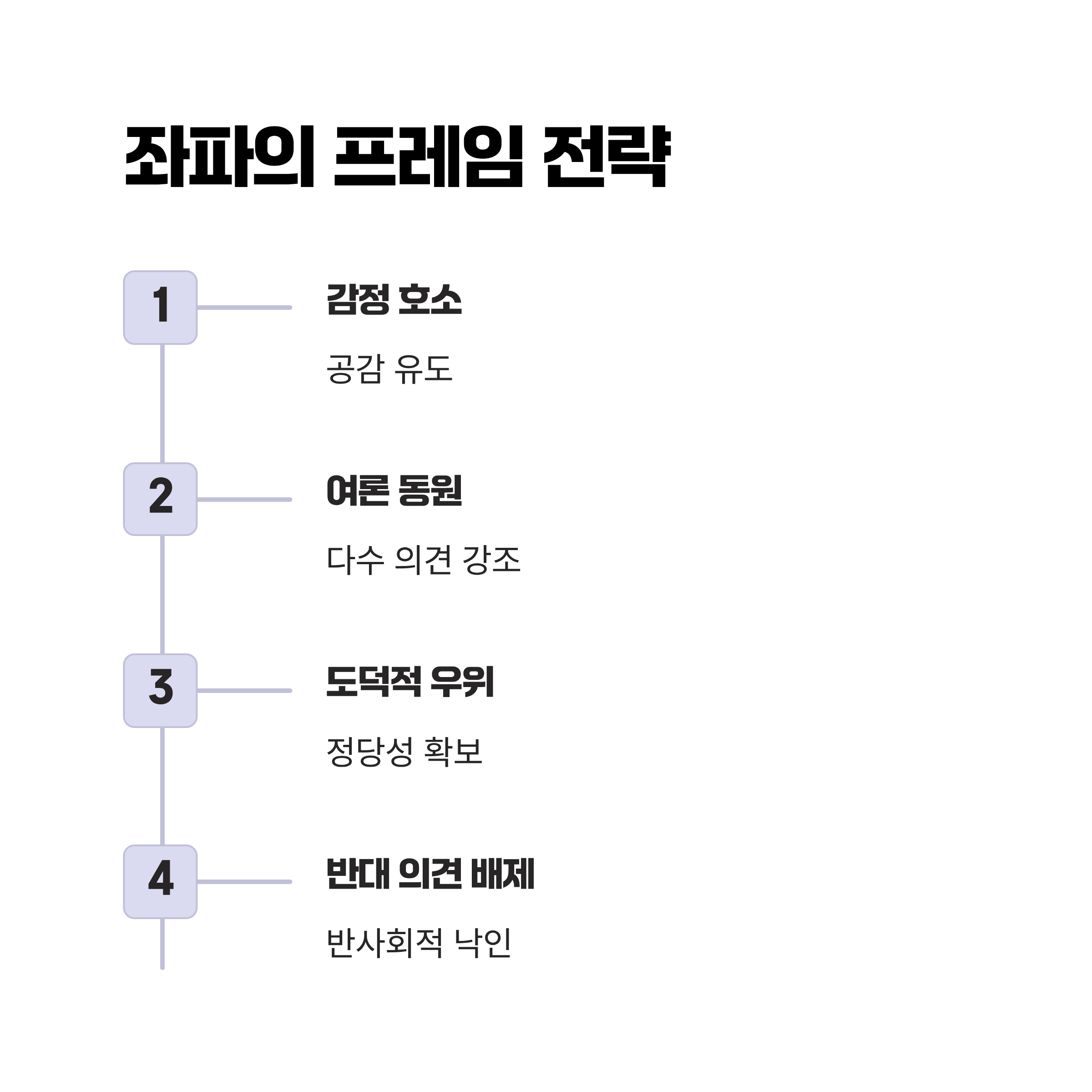 | A. 좌파는 자신을 보다 타협적이고 합리적인 이미지로 포장하려는 경향이 있습니다. 그러나 실제로는 감정적 접근과 여론 연동을 활용해 강력한 정치적 주장도 합니다. |