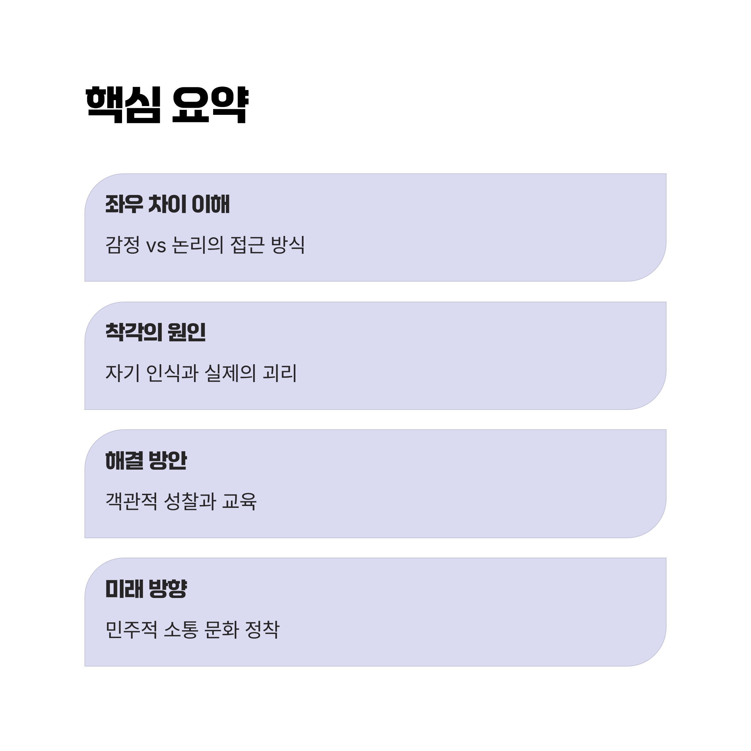 좌파는 감정적으로 수용되는 논리를 발휘하며, 우파는 논리와 사실을 기반으로 한 주장을 펼친다는 차이가 존재한다. 특히 좌파는 공감이나 다수 여론에 의존하는 반면, 우파는 데이터와 역사적 사례를 통한 판단을 중시한다. 이로 인해 좌파는 중도적 이미지를 선호하려는 경향이 강하지만, 실제로는 감정 중심 사고가 정치적 극단성으로 이어질 위험이 있다.