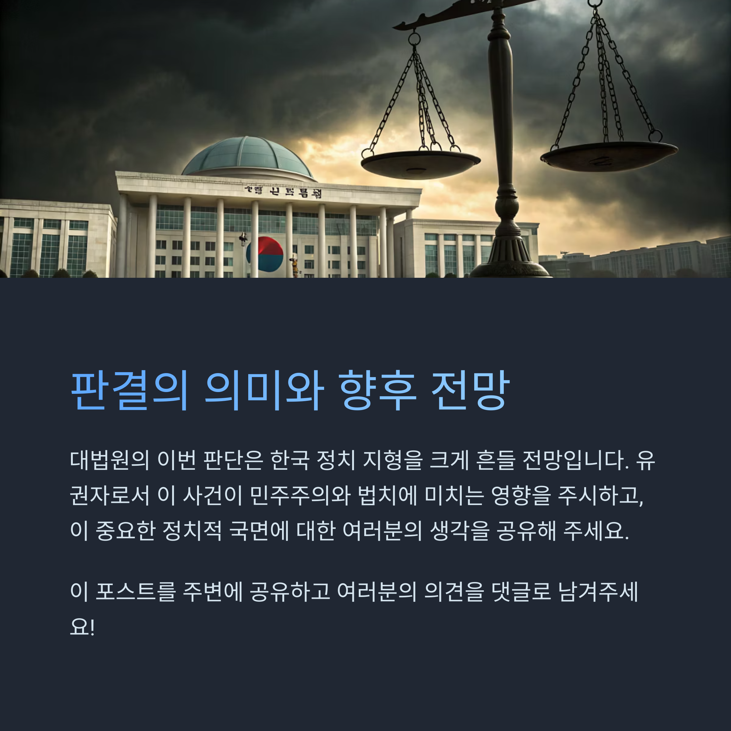 이번 사건은 정치가 법 위에 군림할 수 없다는 사실을 다시 한번 상기시켜 줍니다. 정치인의 책임, 정당의 책임, 그리고 국민의 감시가 모두 중요한 시기입니다. 재판 결과가 어떻게 나오든, 국민의 눈높이에 맞는 선택이 정치권에서 이루어지기를 바랍니다.