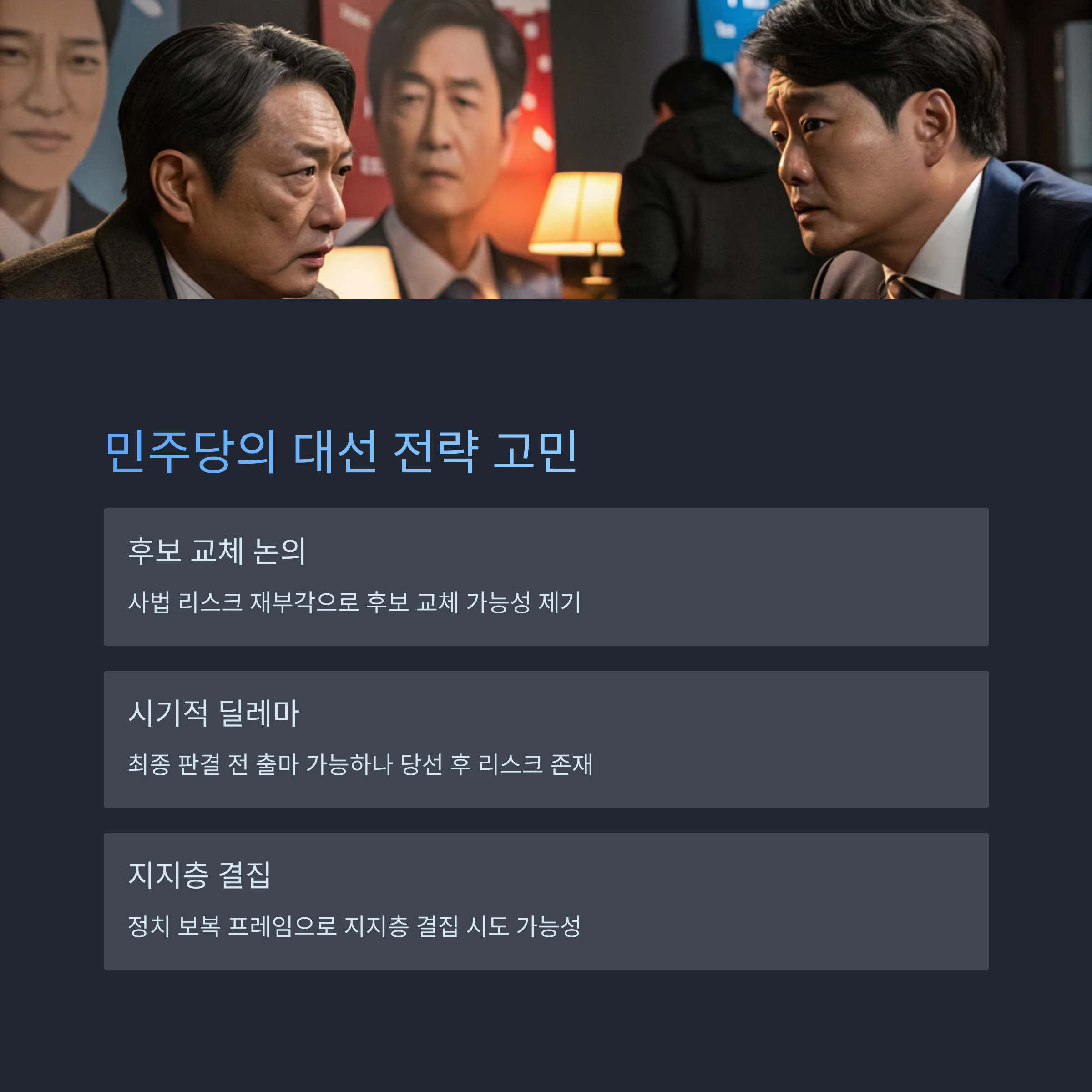 - 대선 후 유죄 확정 시 대통령직 박탈 가능성, 민주당은 후보 교체 고민해야