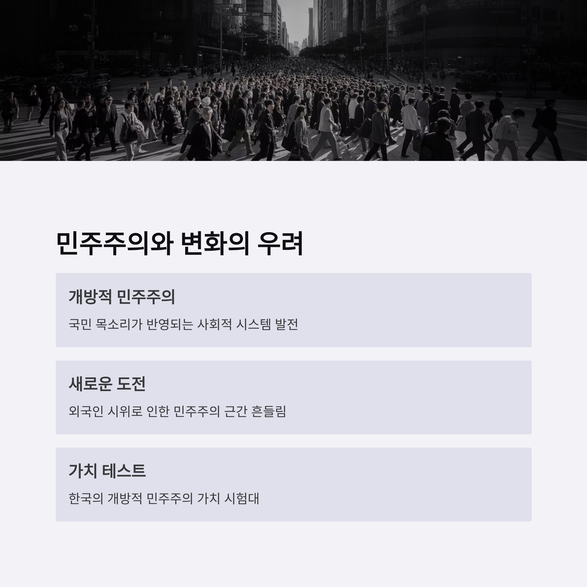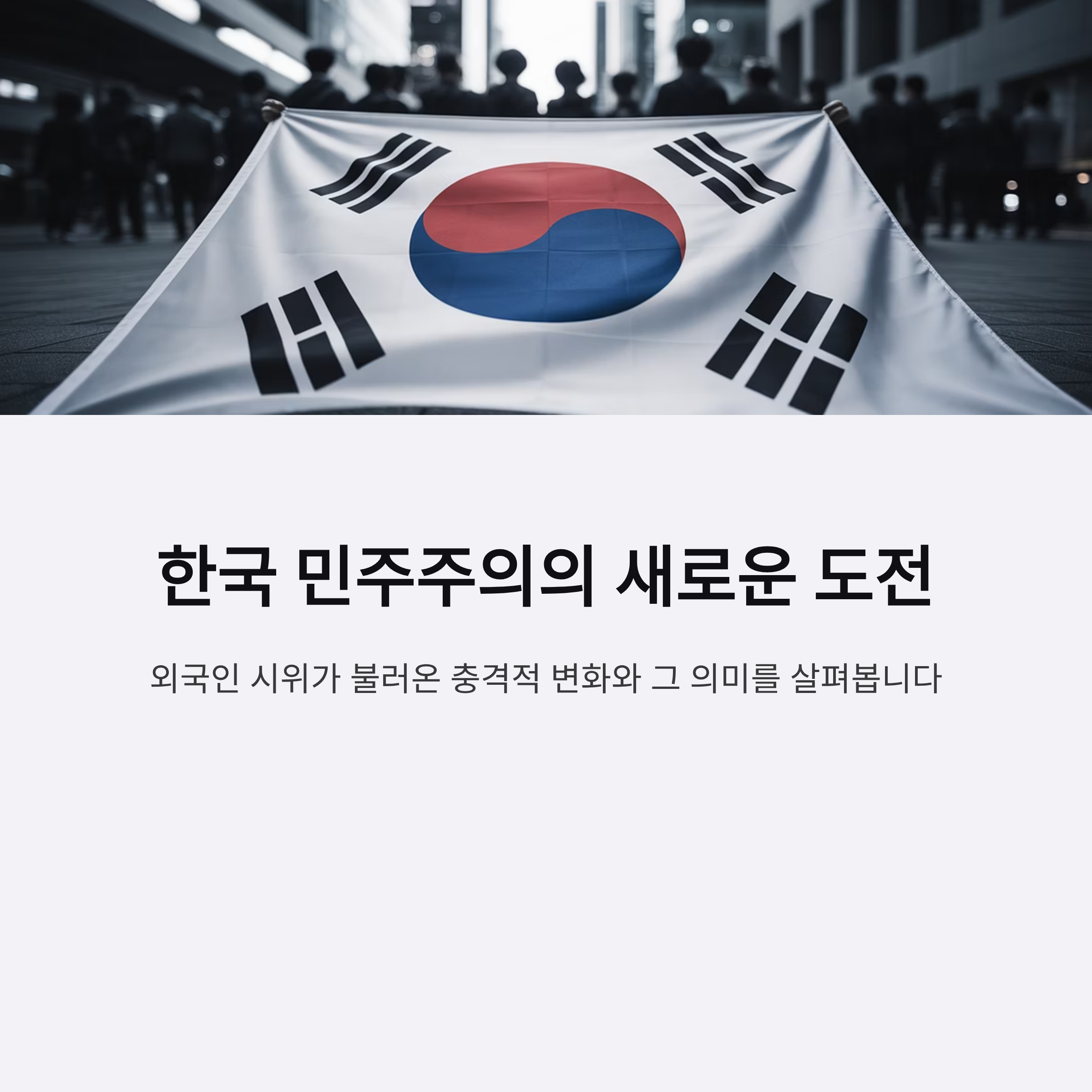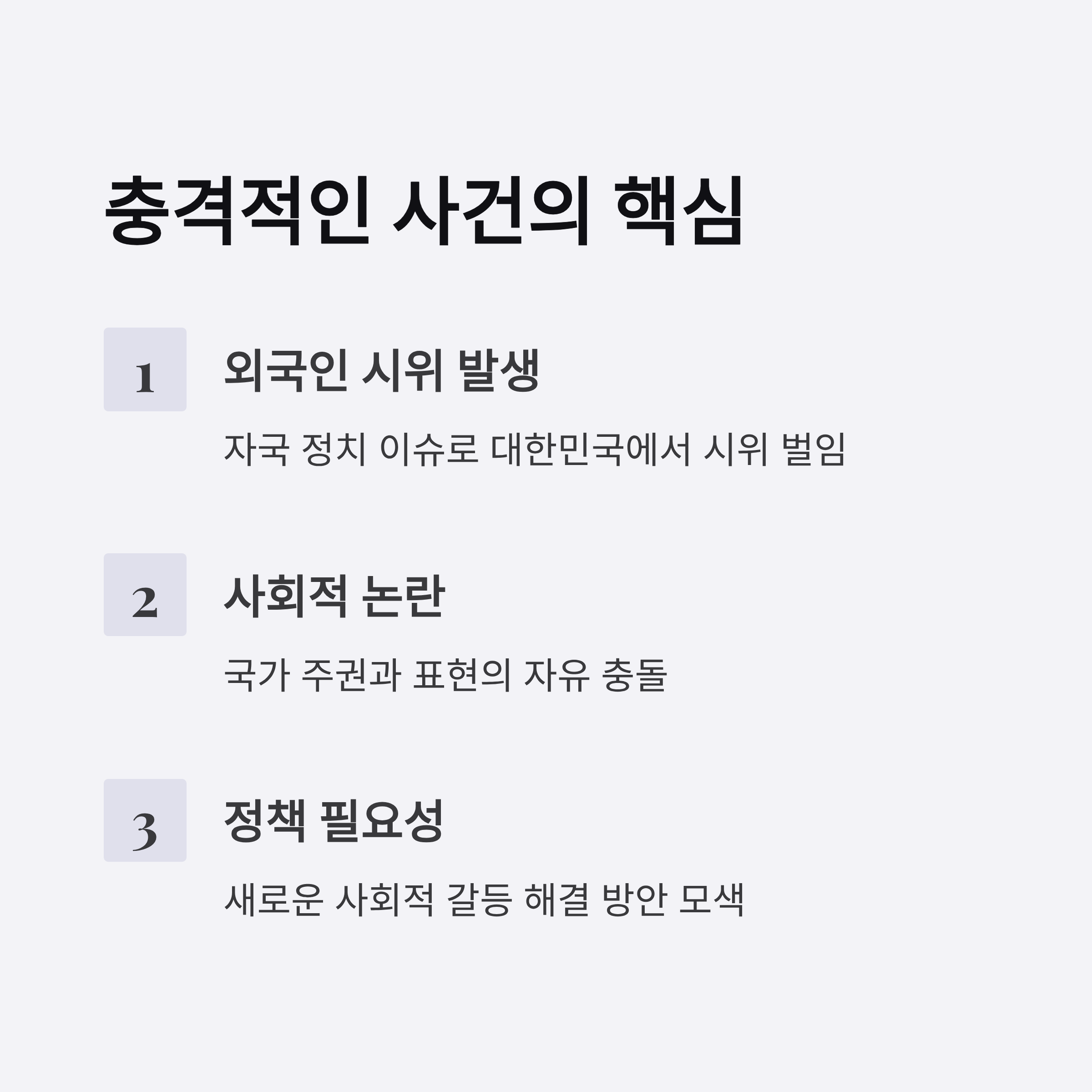 한국은 민주주의 체제를 구축한 이후, 국민들의 목소리가 반영되는 사회적 시스템을 발전시켜 왔습니다. 하지만 최근 민주주의의 근간을 흔드는 문제들이 보고되고 있습니다. 특정 정치적 이슈와 외국인들의 예기치 못한 시위는 많은 논란을 불러일으키고 있는데요. 예컨대, 한국 내 활동 중 일부 외국인들이 자국의 정치적 이슈를 이유로 대한민국에서 시위를 벌이며 충격을 안긴 사건이 있었습니다. 이러한 상황은 한국의 개방적 민주주의 가치가 테스트되고 있는 것처럼 보입니다.