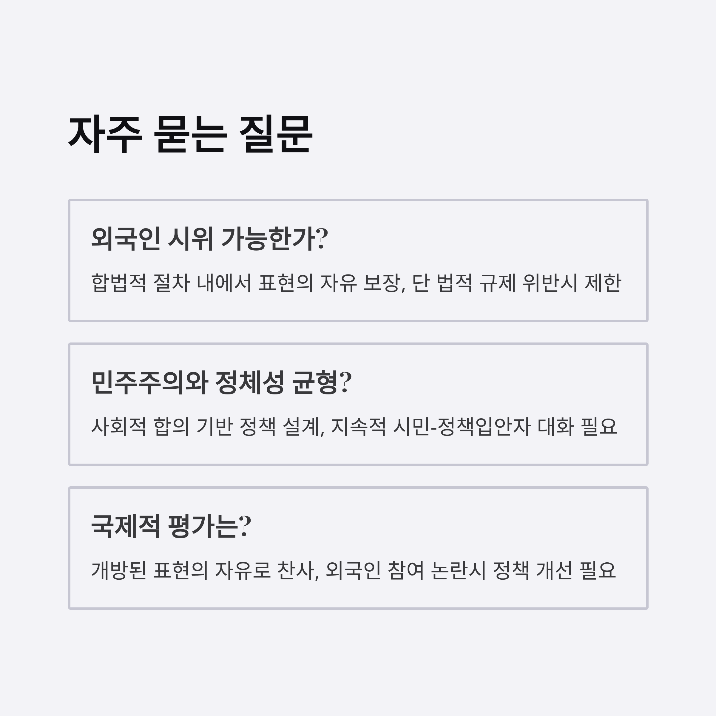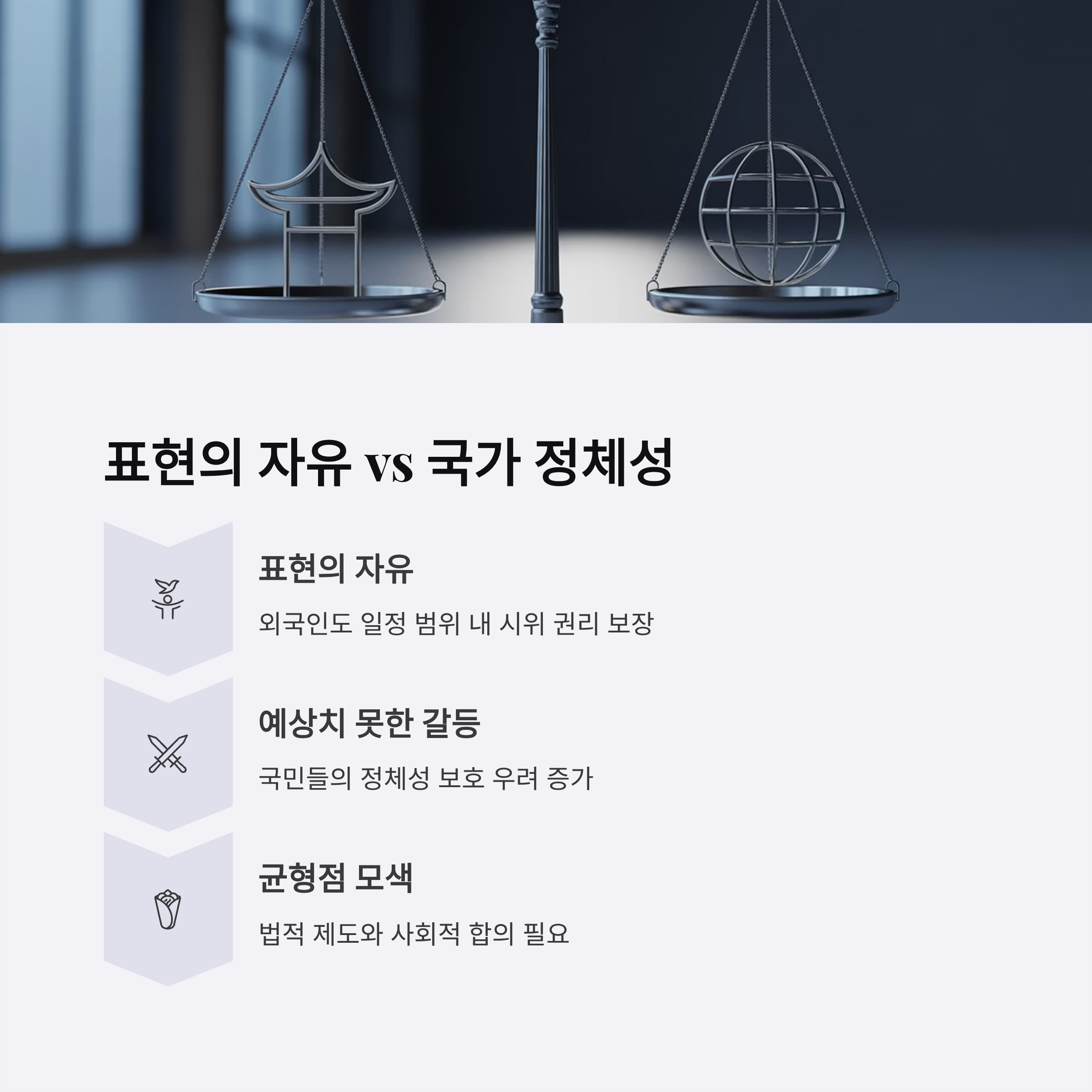 한국은 외국인들에게도 일정한 범위 내에서 표현의 자유를 보장합니다. 서울에서 벌어진 중국인들의 시위는 이러한 민주적 가치를 바탕으로 가능했던 사건입니다. 하지만 이러한 행동은 예상치 못한 갈등을 불러일으켰습니다. 한편, 많은 국민들은 외국인이 대한민국의 정체성과 내부 문제에 직접적으로 영향을 미칠 수 있음을 염려하고 있습니다. 표현의 자유와 국가 정체성 보호 간의 충돌, 이는 법적 제도와 사회적 합의를 통해 해결이 필요한 핵심 과제입니다.