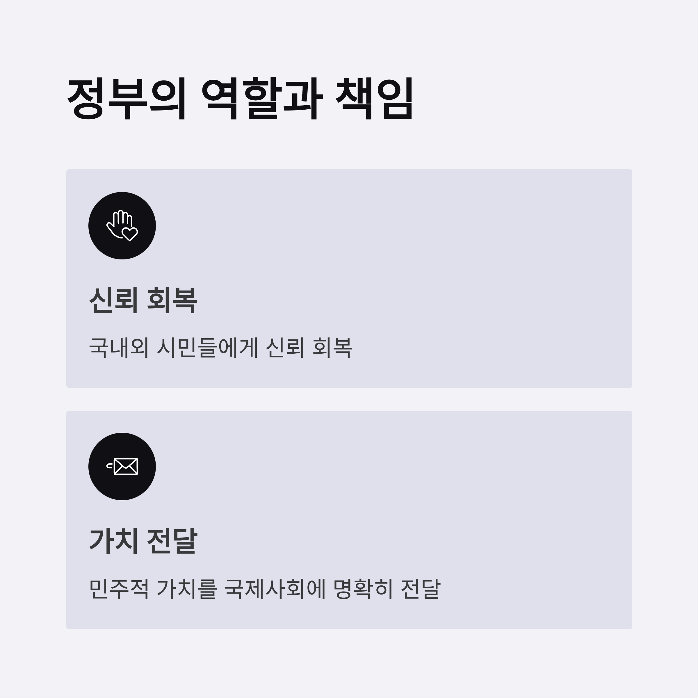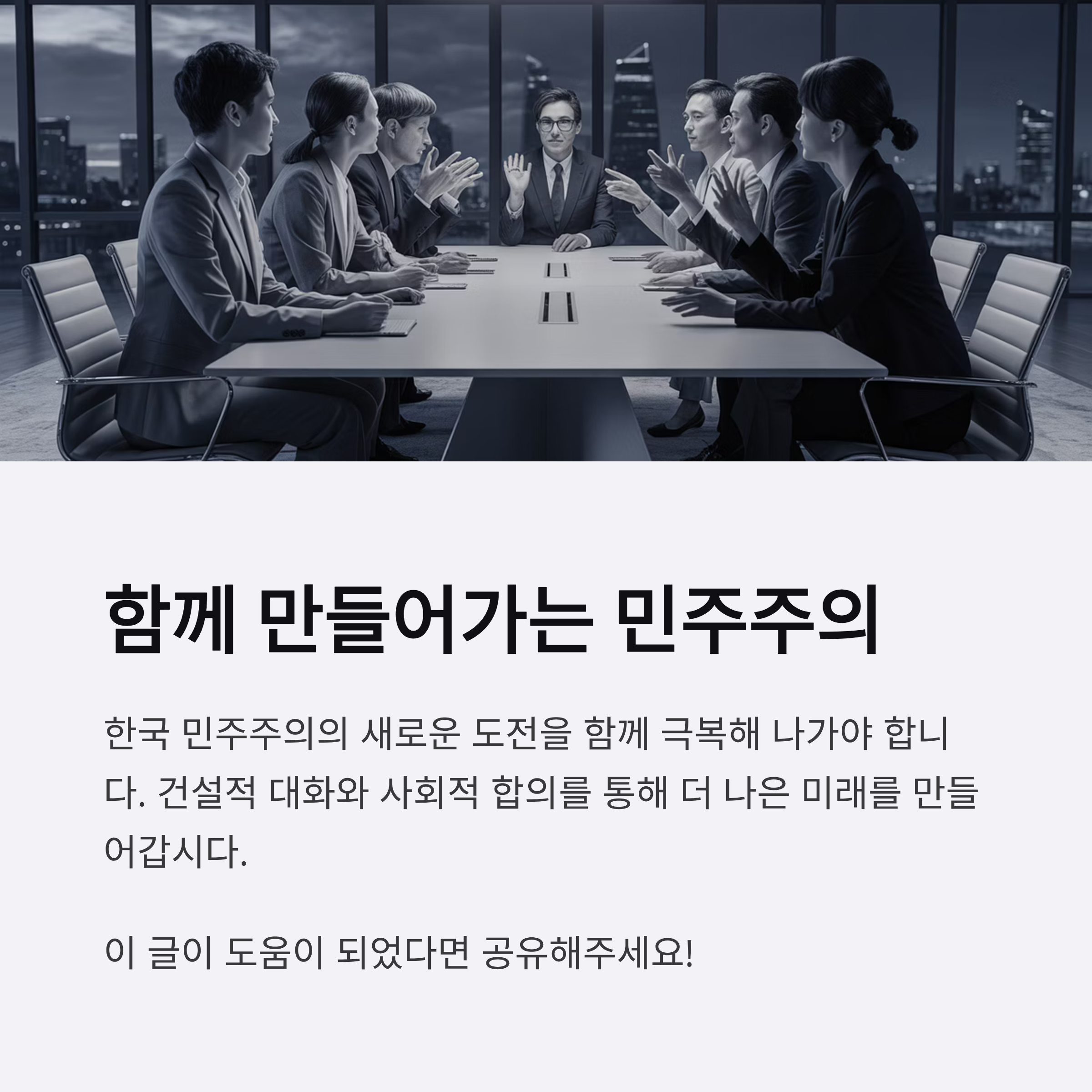 외국인 시위 문제는 민주주의의 근본 가치와 충돌하며, 한국이 직면한 독창적인 도전 과제 중 하나입니다. 이 문제를 해결하기 위해서는 단순히 법적 규제를 강화하는 것이 아니라, 더 깊은 수준의 사회적 합의를 통해 민주주의의 가치를 새롭게 정의할 필요가 있습니다. 한국 정부는 국내외적으로 시민들에게 신뢰를 회복하고 동시에 한국이 추구하는 민주적 가치를 국제 사회에 명확히 전달해야 합니다. 또한 시민들은 이 상황을 정치적 비판보다는 건강한 사회적 대화를 통해 변화의 계기로 삼아야 합니다.