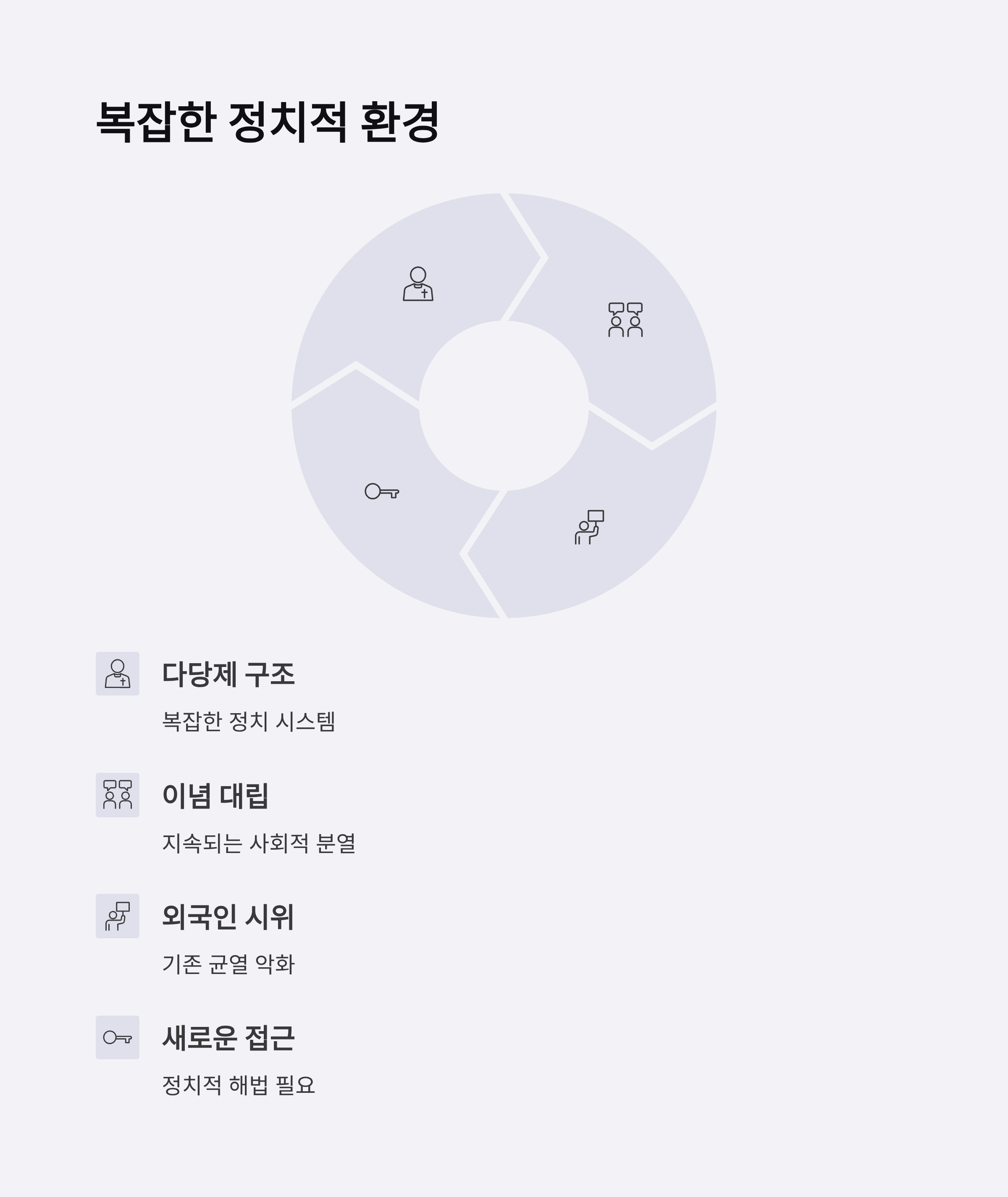 한국의 정치 구조는 복잡한 다당제와 지속되는 이념 대립으로 인해 내외부적으로 변동이 많습니다. 이 와중에 외국인 시위가 발생하며, 사회의 이미 균열된 상태를 더욱 악화시키는 결과를 초래했습니다. 내국인의 권리 우선 정책과 외국인의 권리 보장이 충돌하는 상황에서 새로운 정치적 접근이 필요합니다.