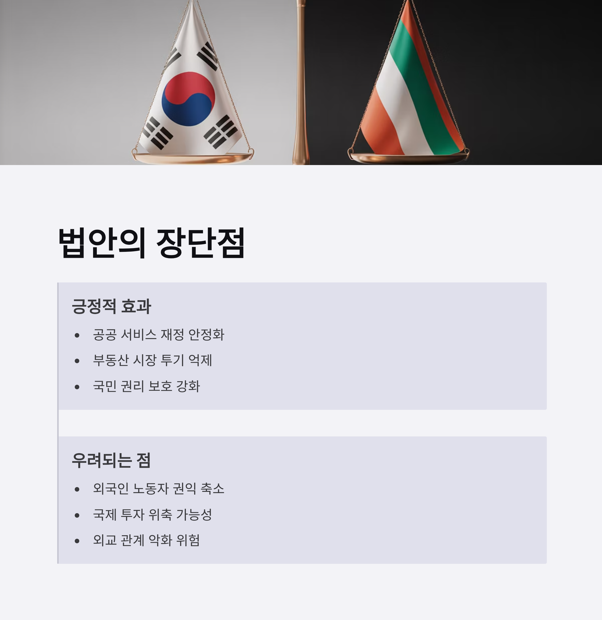 이 법안의 방향성은 국민 이익 보호를 강조하지만, 동시에 외국인 노동자, 국제 투자자, 자국 정부와의 외교 관계에 미치는 영향을 면밀히 고려해야 합니다. 국가 간 상호주의 원칙을 철저히 적용하기 위해서는 보다 세부적이고 실질적인 방안이 요구됩니다.