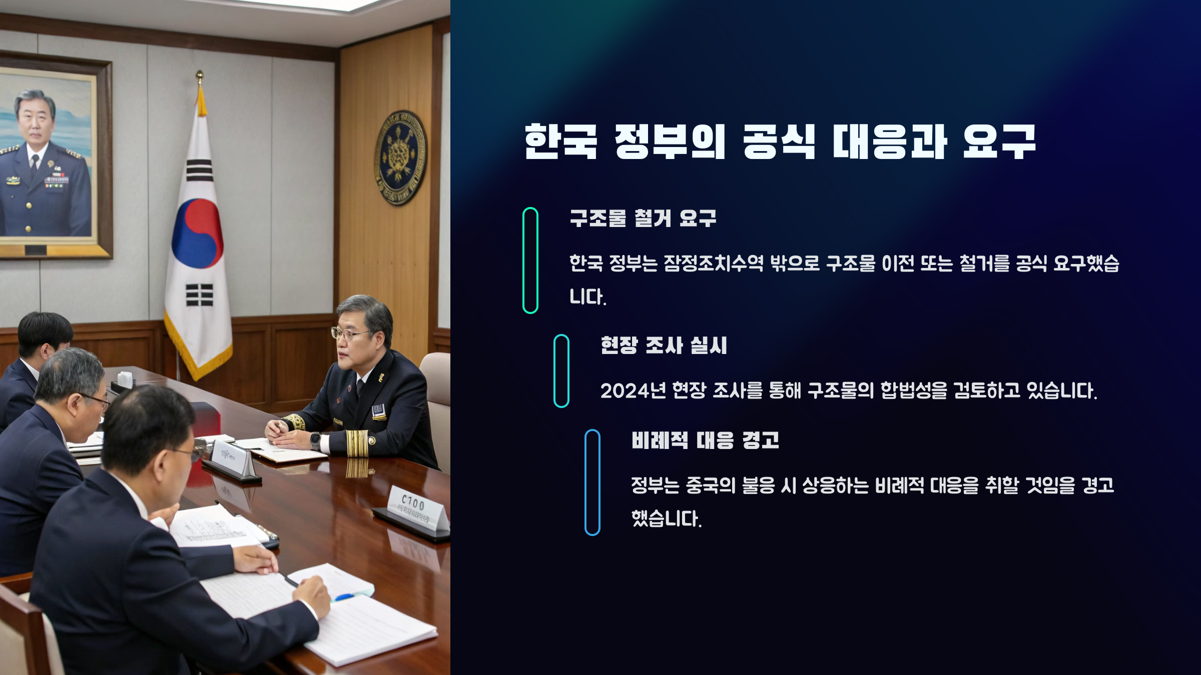 3. 한국 정부는 구조물 철거를 요구하며 현장 조사와 관련 포럼을 통한 대화를 모색하고 있습니다.