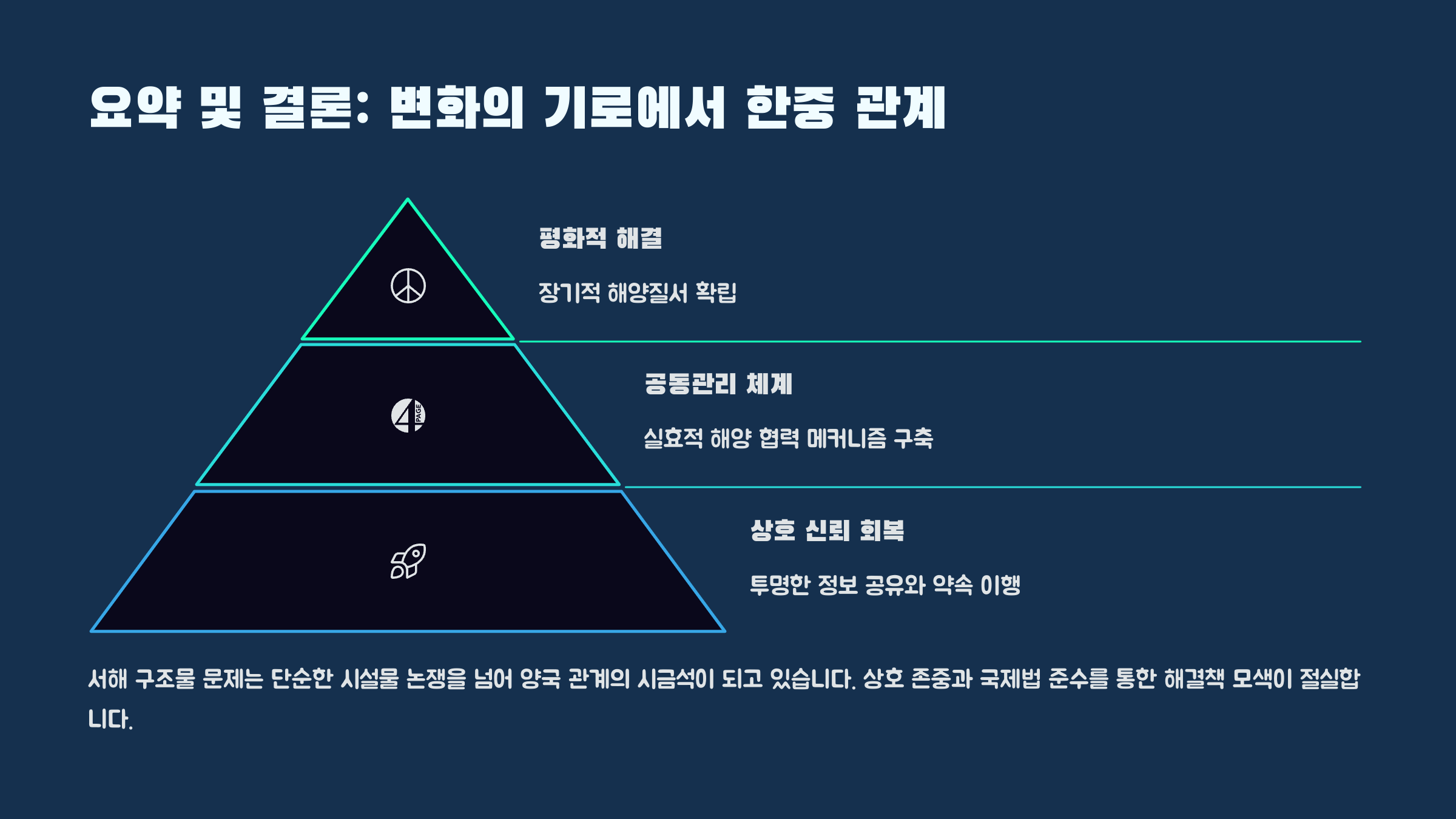 이번 서해 중국 구조물 사건은 양국 간 해양 자원과 영유권 분쟁을 해결하기 위한 많은 과제를 던져주고 있습니다. 구조물 문제는 단순한 해양시설의 정당성 여부를 넘어, 두 나라 사이의 역사적, 정치적 긴장이 내포된 이슈로, 단기적인 해결책을 찾아내기 어렵습니다.