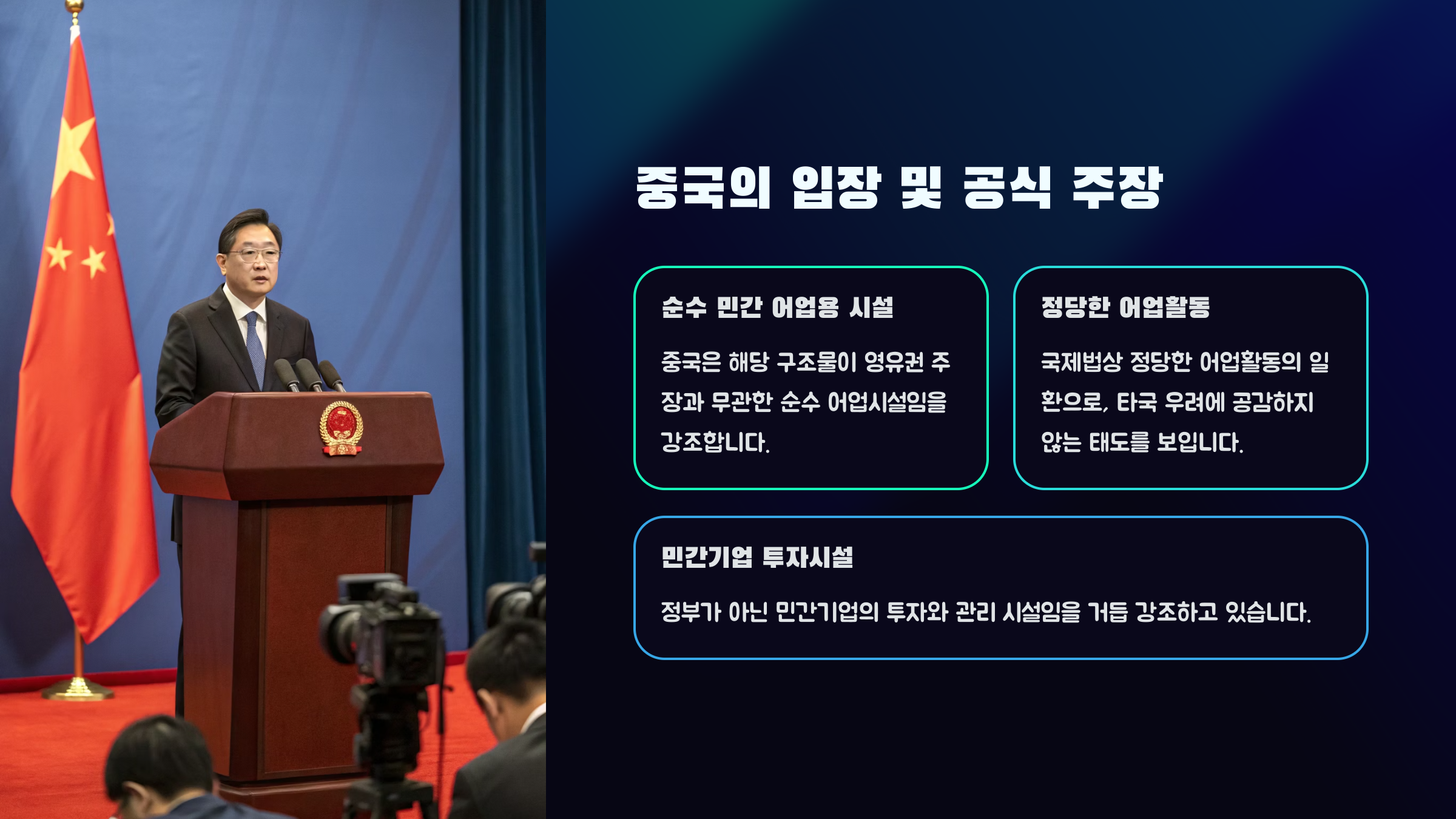 4. 중국은 해당 시설이 정당한 어업활동의 일환임을 강조하며, 한국의 우려를 공감하지 않는 태도를 보이고 있습니다.