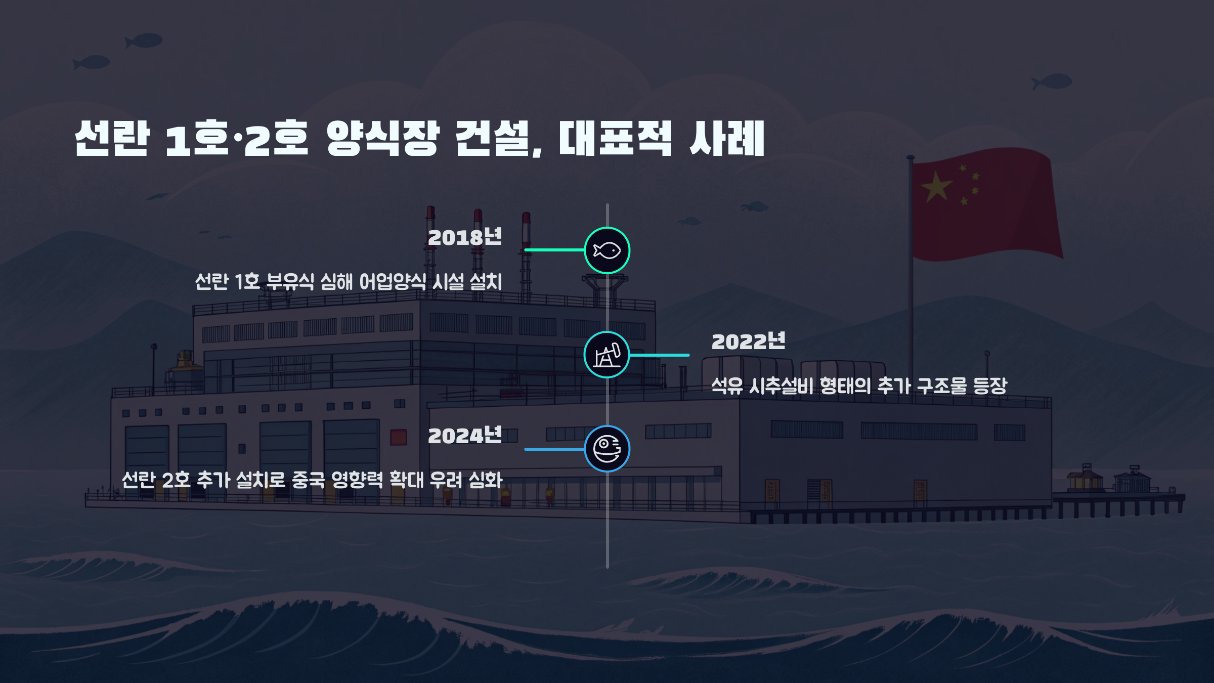 2. 대표적으로 선란 1호 및 2호 양식장이 2018년과 2024년 건설되어 우려를 증폭시키고 있습니다.