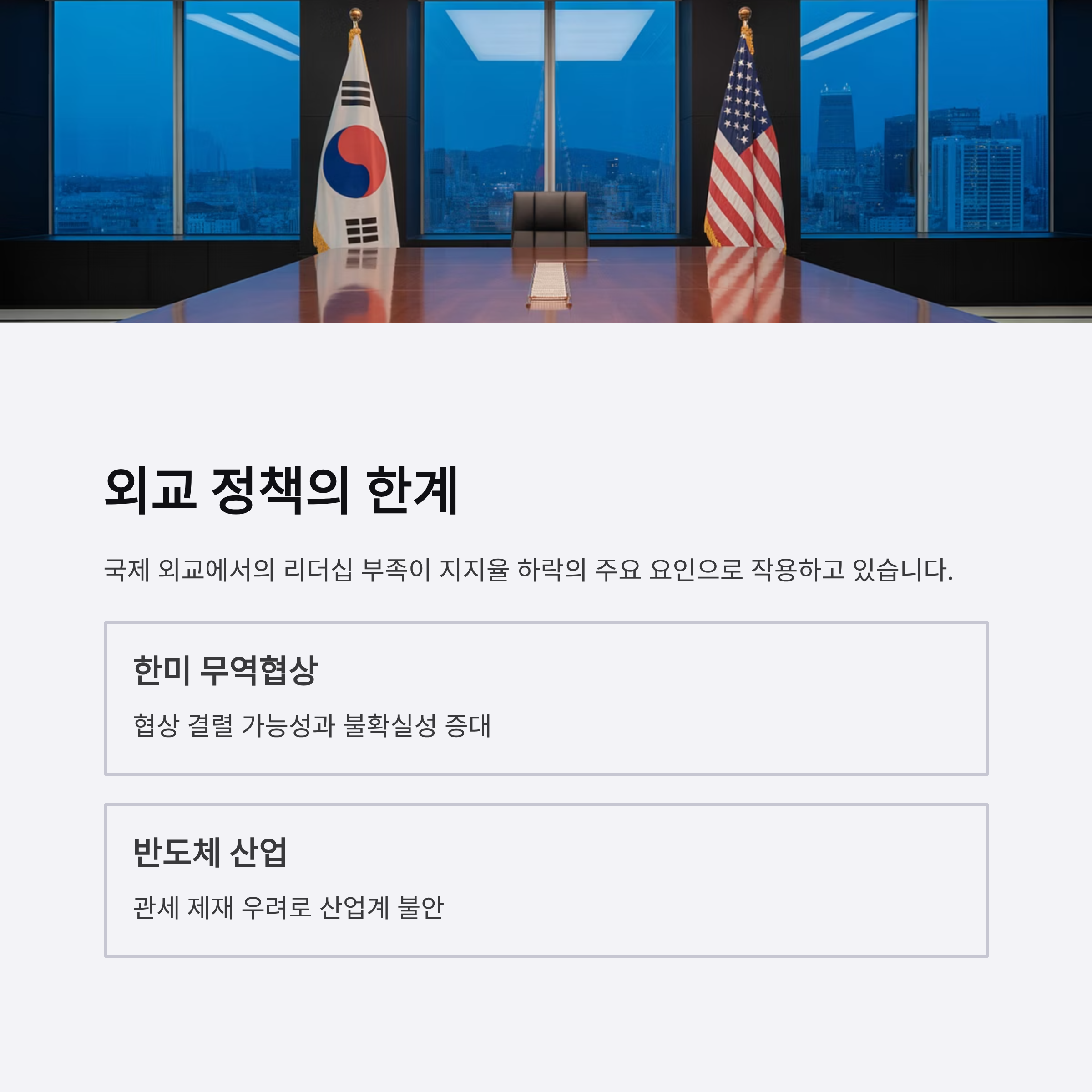 국제 외교에서 보여준 리더십 부족 역시 지지율 침체의 한 축으로 작용하고 있다. 한미 무역 협상 결렬 가능성과 반도체 등 주요 산업 품목에서 관세 제재 우려가 지속되는 가운데, 이재명 대표가 뚜렷한 대응 방안을 제시하지 못한 것이 비판의 대상이 되고 있다. 국민들은 경제 불확실성을 직접 체감하며, 지도자로서의 비전과 전략 부재에 대해 냉소적 태도를 보이고 있다.