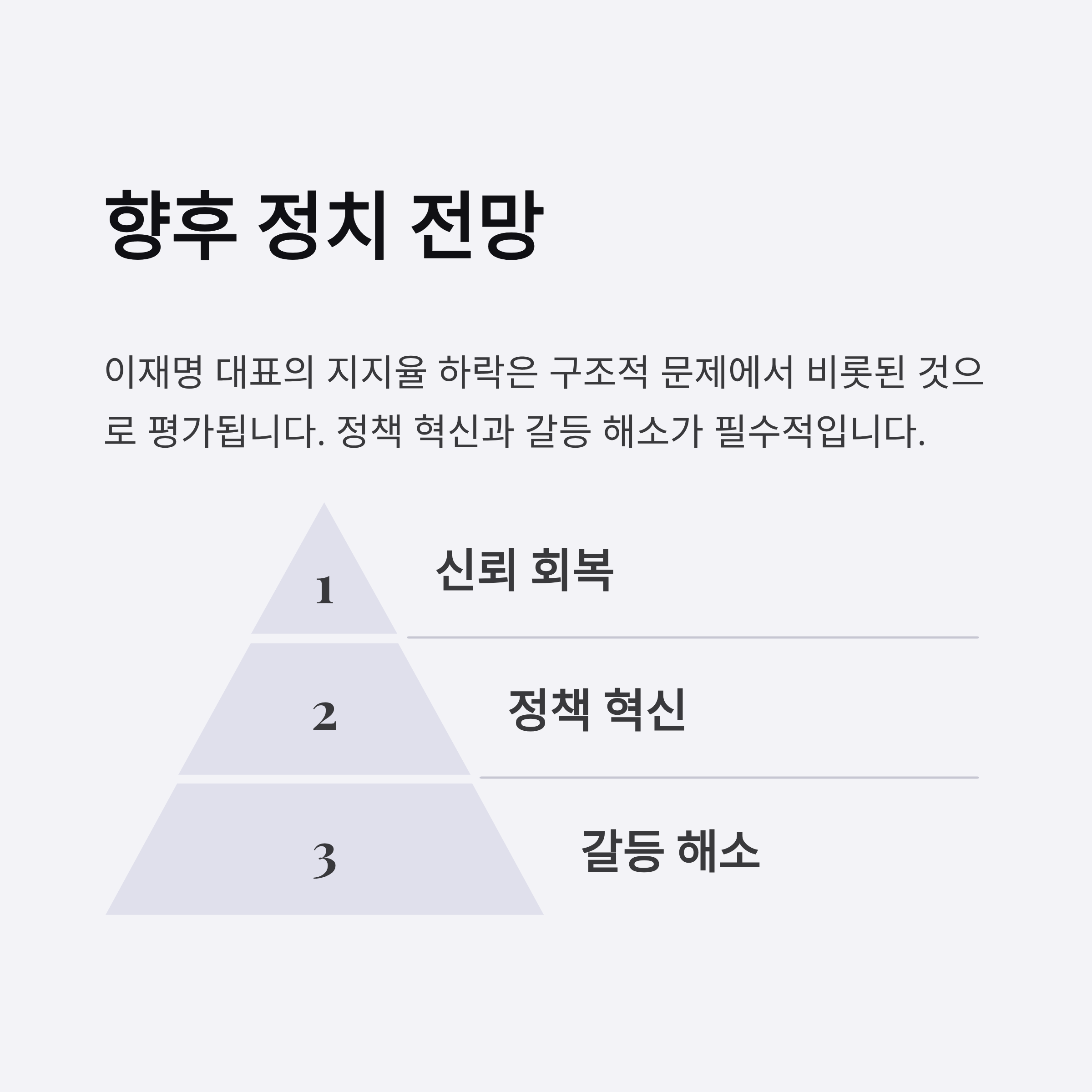 따라서 향후 지지율 반등을 기대하기 위해서는 세 가지 방향성이 요구된다. 첫째, 당내 단합을 위한 리더십 강화 및 권력 구조 조정이 필요하다. 둘째, 국민들이 체감할 수 있는 정책 성과 창출에 집중해야 한다. 셋째, 국제적 협상에서 신뢰를 구축하며 국가의 위상을 높이는 것이 중요하다. 이를 통해 이재명와 여권이 국민 신뢰를 회복하고, 장기적 정치적 안정을 도모할 수 있을지 주목된다.