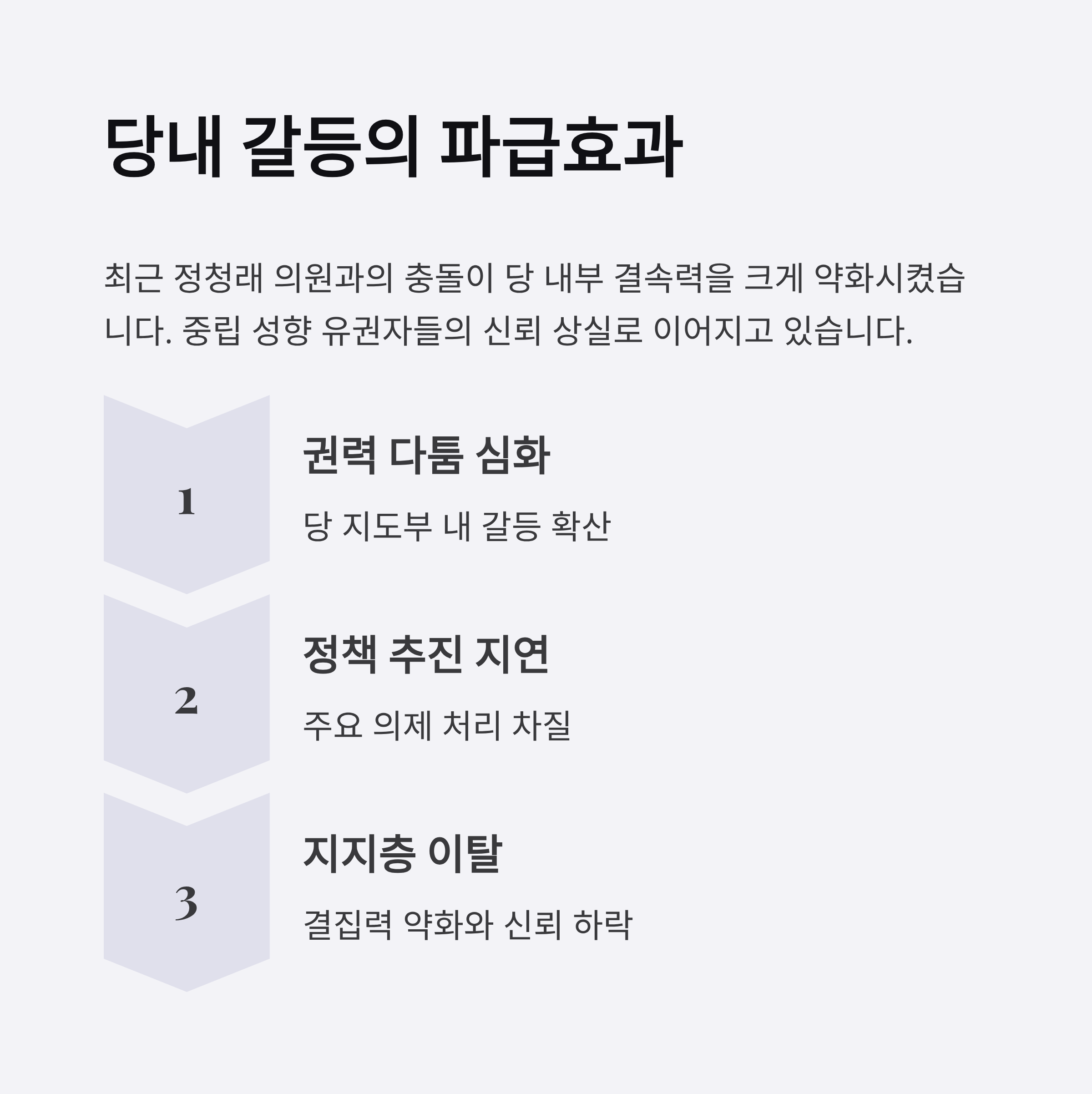 이재명의 지지율 하락에는 내부 갈등이 가장 큰 영향을 미치고 있다. 최근 정청래 의원과의 충돌이 당 내부 결속력을 약화시키며 부정적 여론을 확대시켰다. 이로 인해 중립 성향의 유권자들조차 당에 대한 신뢰를 잃었고, 지지층의 결집력 또한 낮아졌다. 특히 당 지도부 내 권력 다툼은 주요 의제의 원활한 추진을 방해하며 국정 운영 성과와 직결되고 있다.
