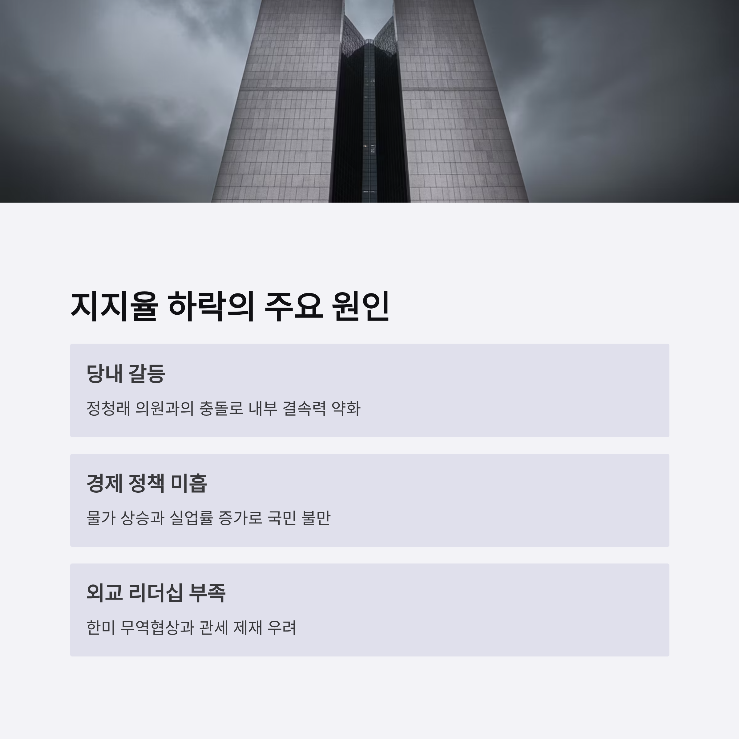 이재명, 지지율 하락, 국정 운영, 당내 갈등, 외교 정책, 경제 문제, 정청래, 정치 분석, 여야 지도자, 정치 전망