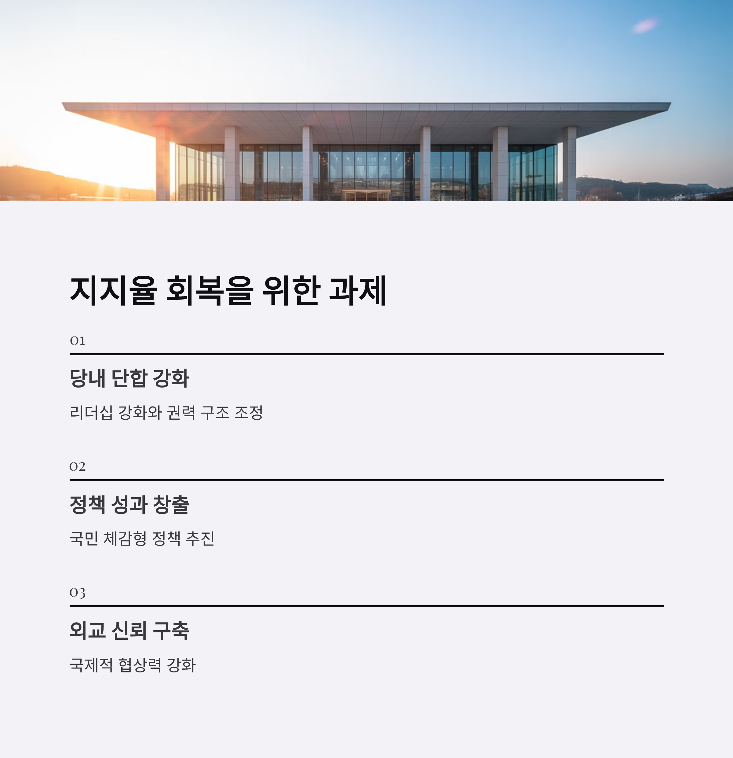 | A. 지지율 회복의 핵심은 신뢰 회복을 위한 구체적 정책 추진에 달려 있습니다. 예산 투명성 강화, 실질적인 경제·외교 성과 창출, 권위적인 내부 문제 해결 등이 필요하며 국민들에게 직접적으로 변화를 체감하도록 해야 합니다. |
