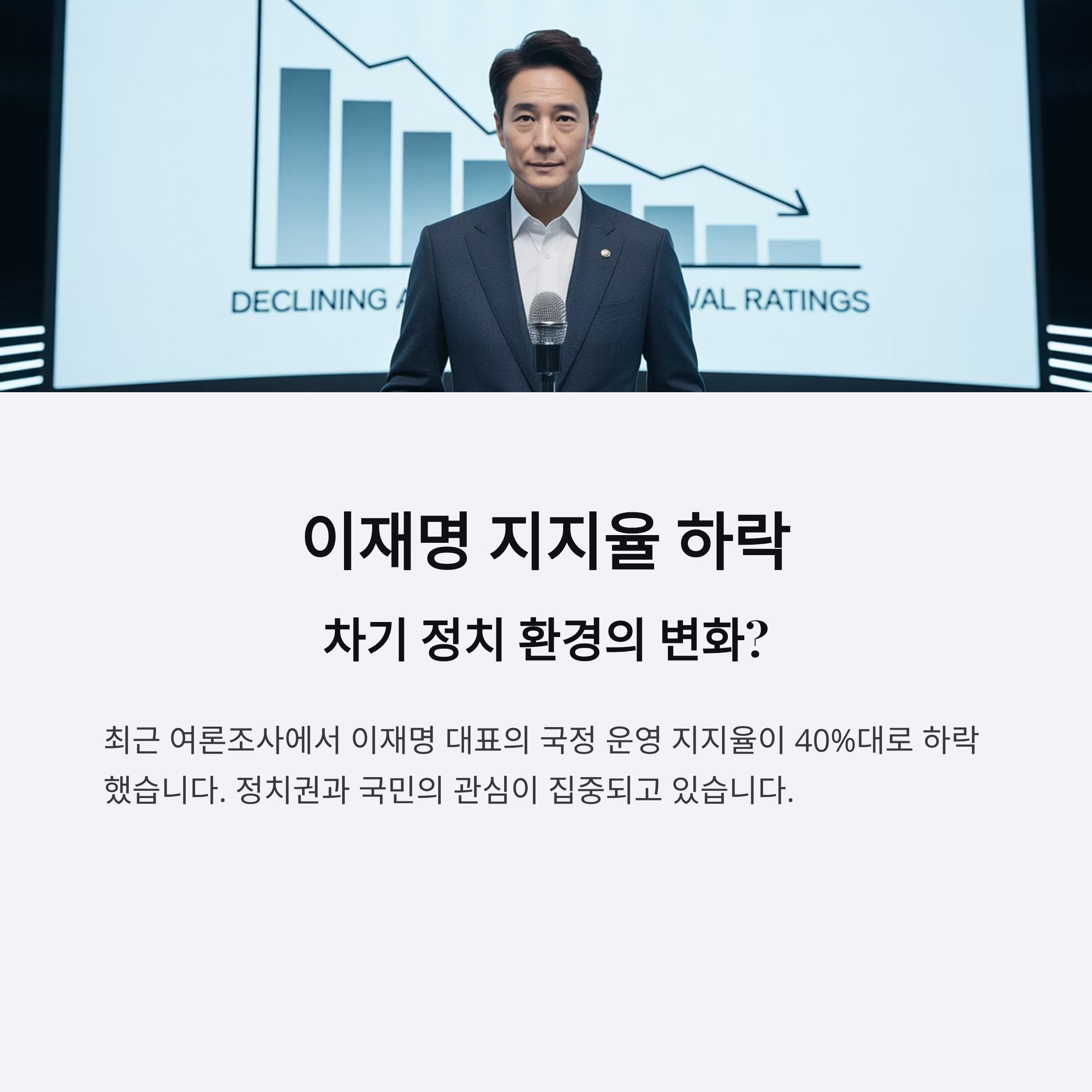 최근 공개된 여론 조사에서 이재명의 국정 운영 지지율이 약 40%대로 하락한 것이 확인되었습니다. 이는 정치권 및 국민의 광범위한 관심을 집중시키는 사안으로 떠오르고 있습니다. 이재명 대표는 출범 초기 높은 신뢰도를 기록했지만, 최근 정치적 이슈와 내부 갈등, 경제 및 외교적 도전 과제로 국민적 신뢰가 흔들리고 있는 것으로 보입니다. 이번 지지율 변화는 단순한 수치적 하락을 넘어 앞으로의 정치 환경에도 중요한 변화를 불러올 가능성이 큰 상황입니다.