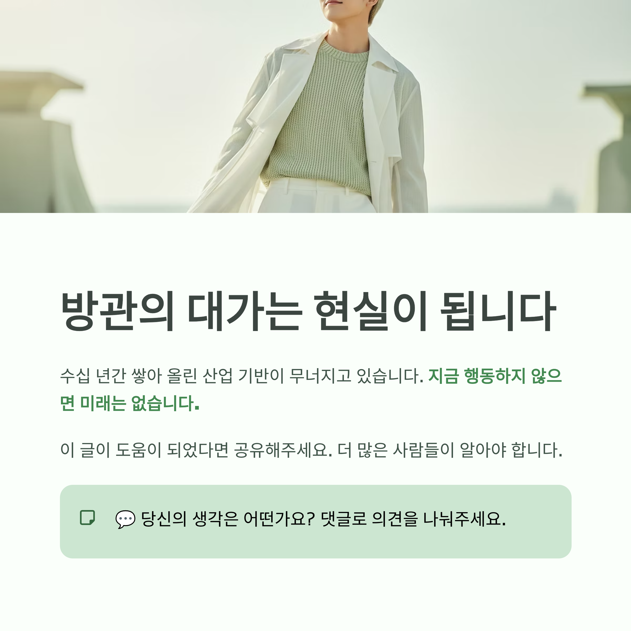 ‘나는 괜찮겠지’, ‘설마 나라가 망하겠어’라는 방관적 태도가 계속된다면, 미래 세대는 ‘왜 그때 아무도 막지 않았는가’라고 원망하게 될 것입니다.