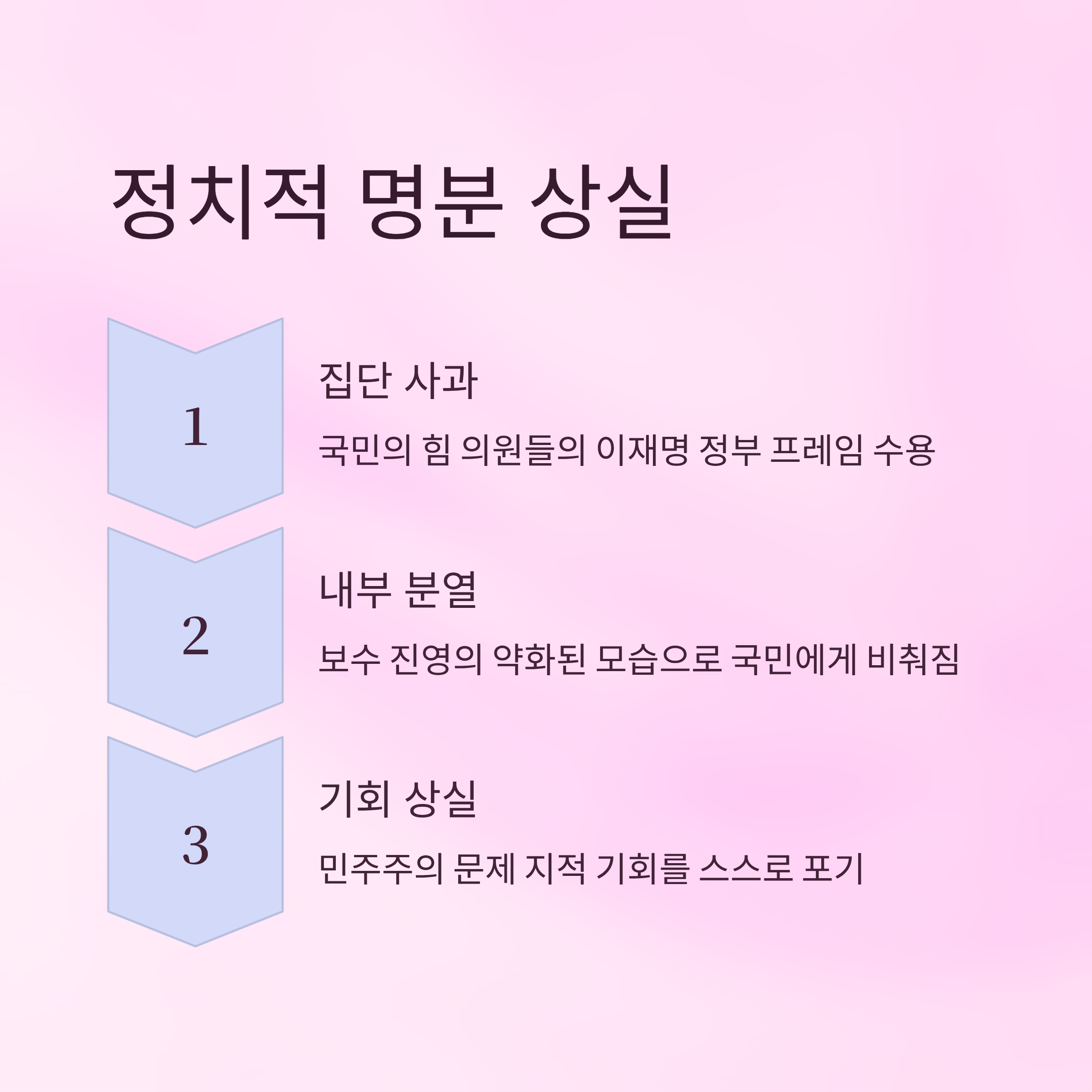 국민의 힘 의원들의 집단 사과는 결과적으로 보수 진영의 정치적 명분을 약화시키는 결과를 낳았습니다. 명분은 한 국가의 흐름을 바꾸는 데 있어 중요한 정치적 요소입니다. 그러나 이번 사과는 이재명 정부의 정책 방향을 잘못 대응한 결과로, 국민들에게 보수 진영의 내적 분열로 비춰졌습니다. 이로 인해 국민의 힘은 이재명 정부와 민주주의 문제를 효과적으로 지적할 기회를 상실했고, 이는 한국 내 자유민주주의 위기론에 신뢰성을 약화시켰습니다.