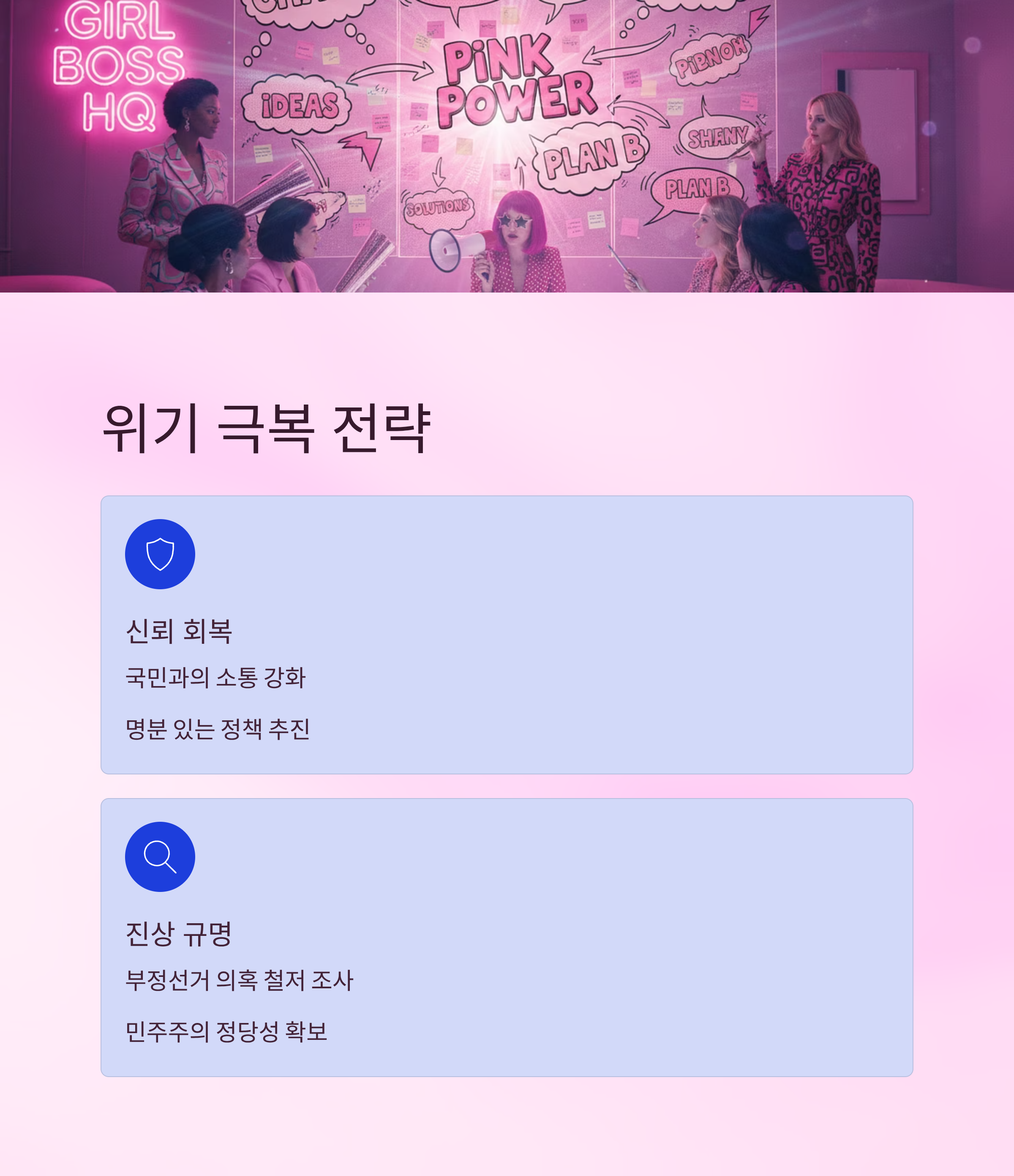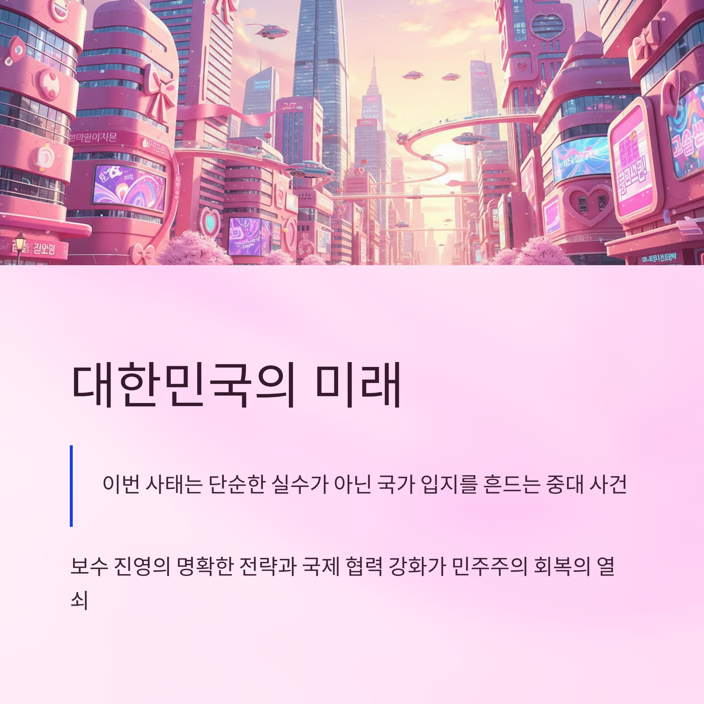 | A. 보수 진영은 국민 신뢰 회복과 명분 강화를 위해 내부 단결을 이루고, 한미 협력을 통해 국제적 입지를 다지는 데 초점을 맞춰야 합니다. |