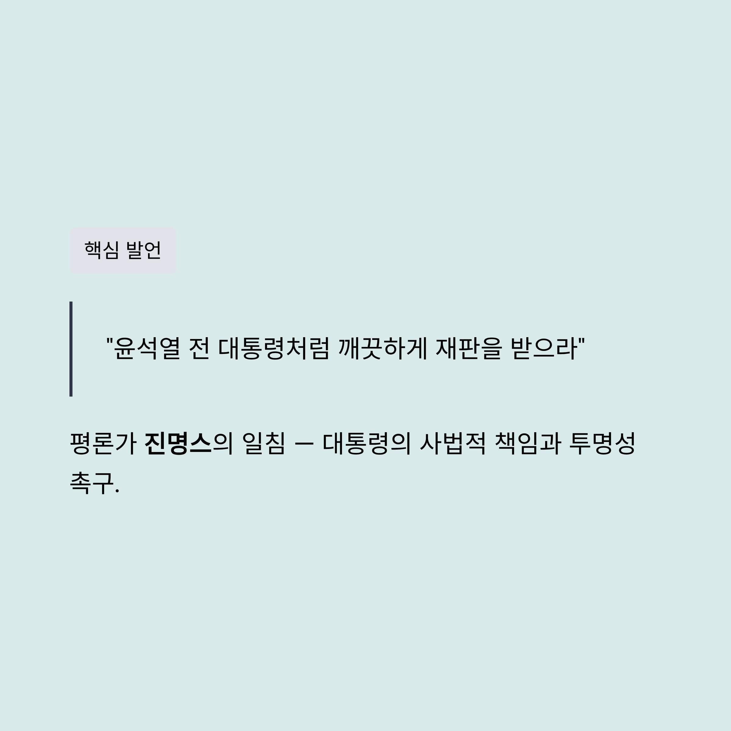 | Q1. '진명스'가 이재명 대통령에게 재판을 받으라고 요구하는 핵심 이유는 무엇인가요? |