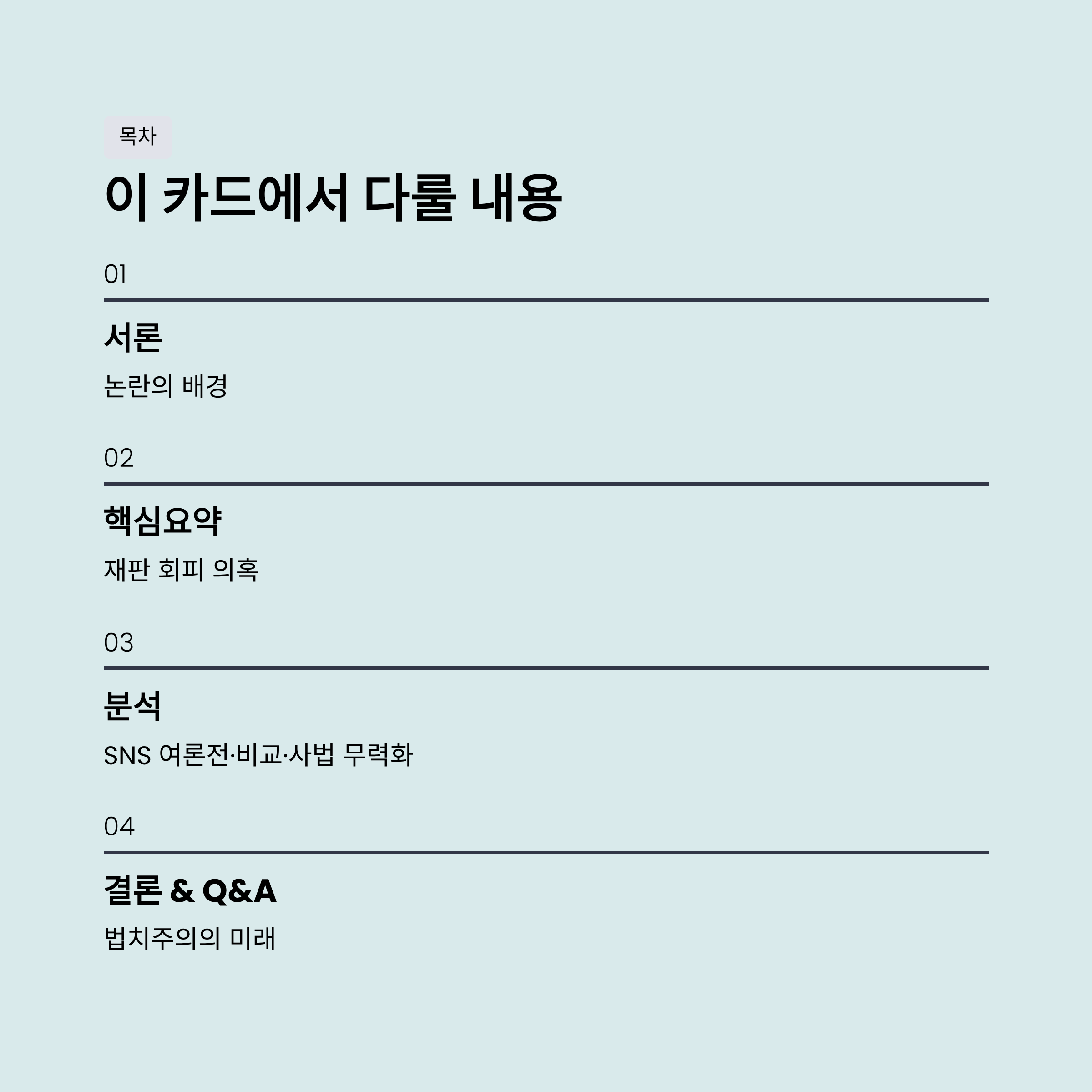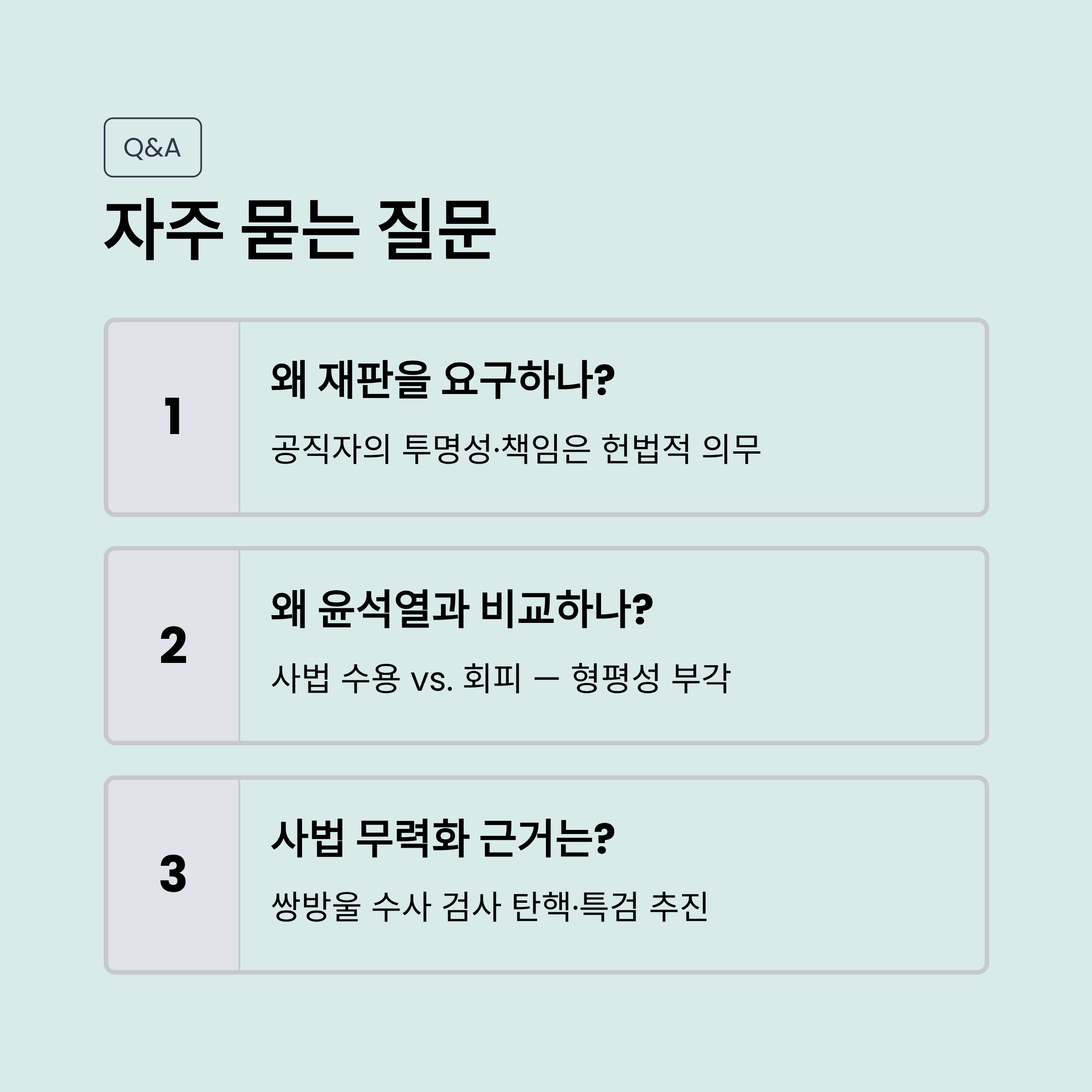 - 분석: 재판 회피 의혹, 도덕성 압박, 사법부 무력화 시도