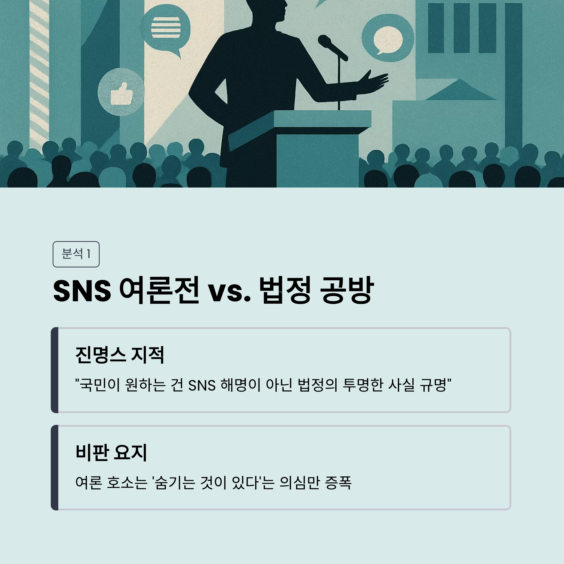 이재명 대통령이 SNS를 통해 자신의 혐의를 '조작'이라 주장하며 여론전을 펼치자, '진명스'를 포함한 비판 진영은 이를 사법 절차를 회피하려는 시도로 규정했습니다.