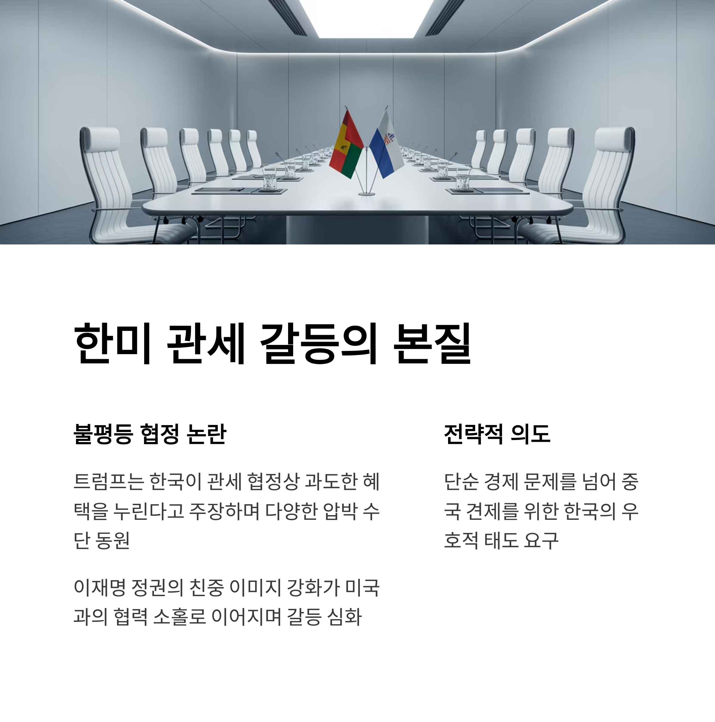 미국과 한국 간의 관세 문제는 트럼프의 정책 초반부터 불거진 주요 갈등 이슈 중 하나였습니다. 트럼프는 한국이 관세 협정상의 불평등 혜택을 누리고 있다는 주장을 펼쳤으며, 이를 바로잡기 위해 다양한 압박 수단을 사용했습니다. 이재명 정권이 친중 이미지를 강화하면서 미국과의 협력관계를 소홀히 한다는 인식은 이러한 갈등을 더욱 부각시킨 요인입니다.