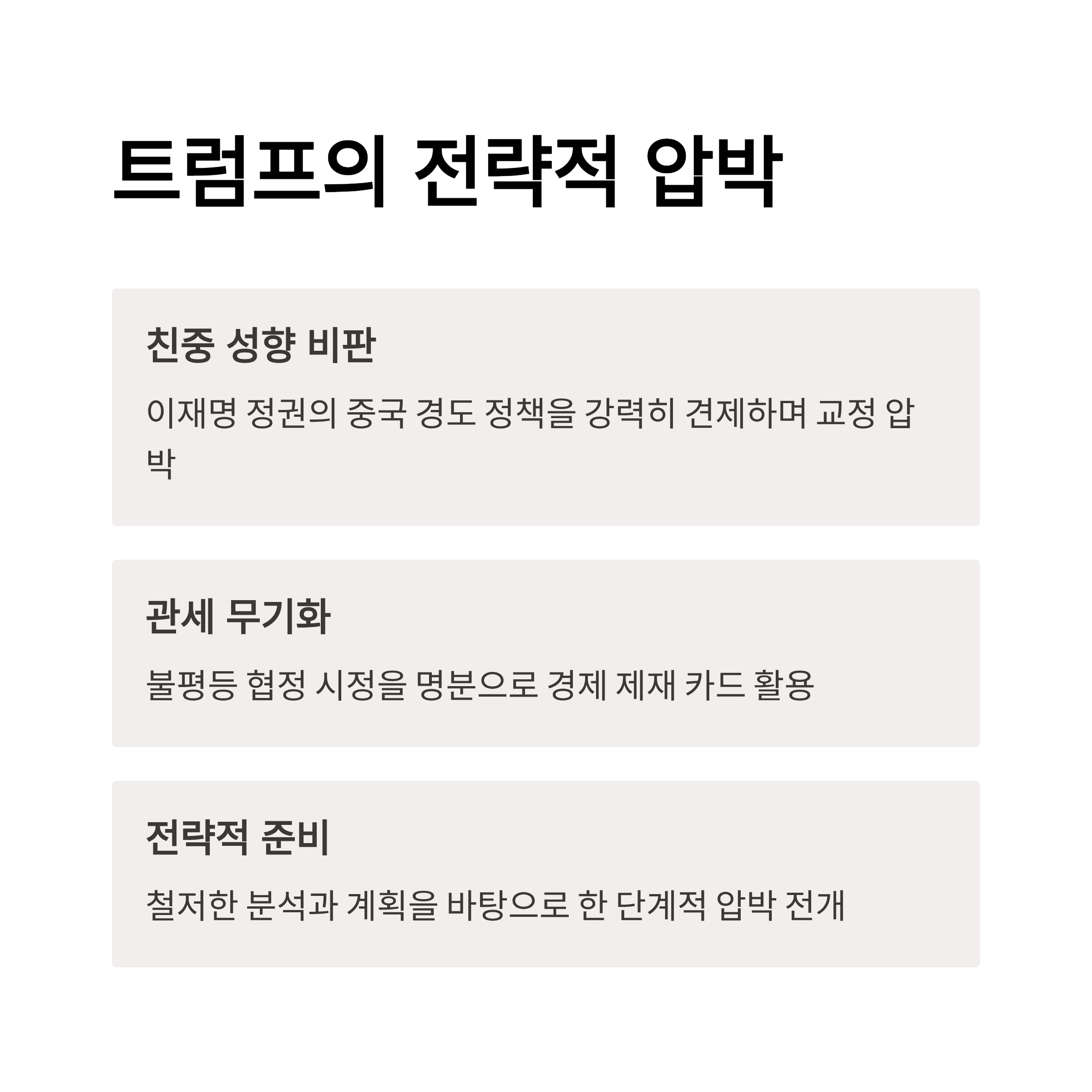 1. 도널드 트럼프의 외교 전략은 한국 이재명 정권의 친중 성향을 강력히 비판하며 교정하려 하고 있습니다.