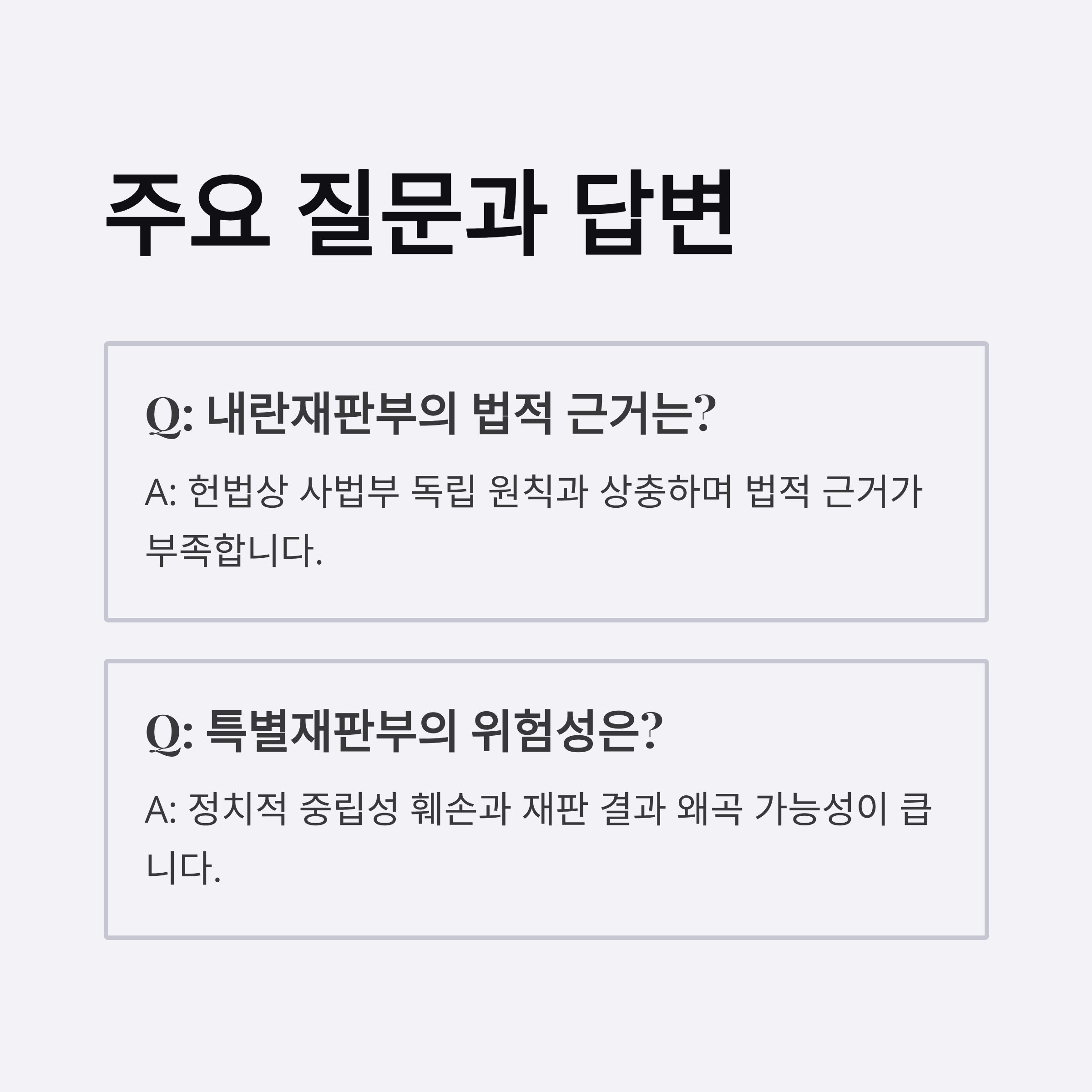 | A. 내란재판부는 헌법 상 명시된 사법부 독립 원칙과 상충합니다. 이는 특정 사건을 정치적으로 처리하기 위해 법적 근거 없이 재판부를 구성하는 문제를 야기합니다. |