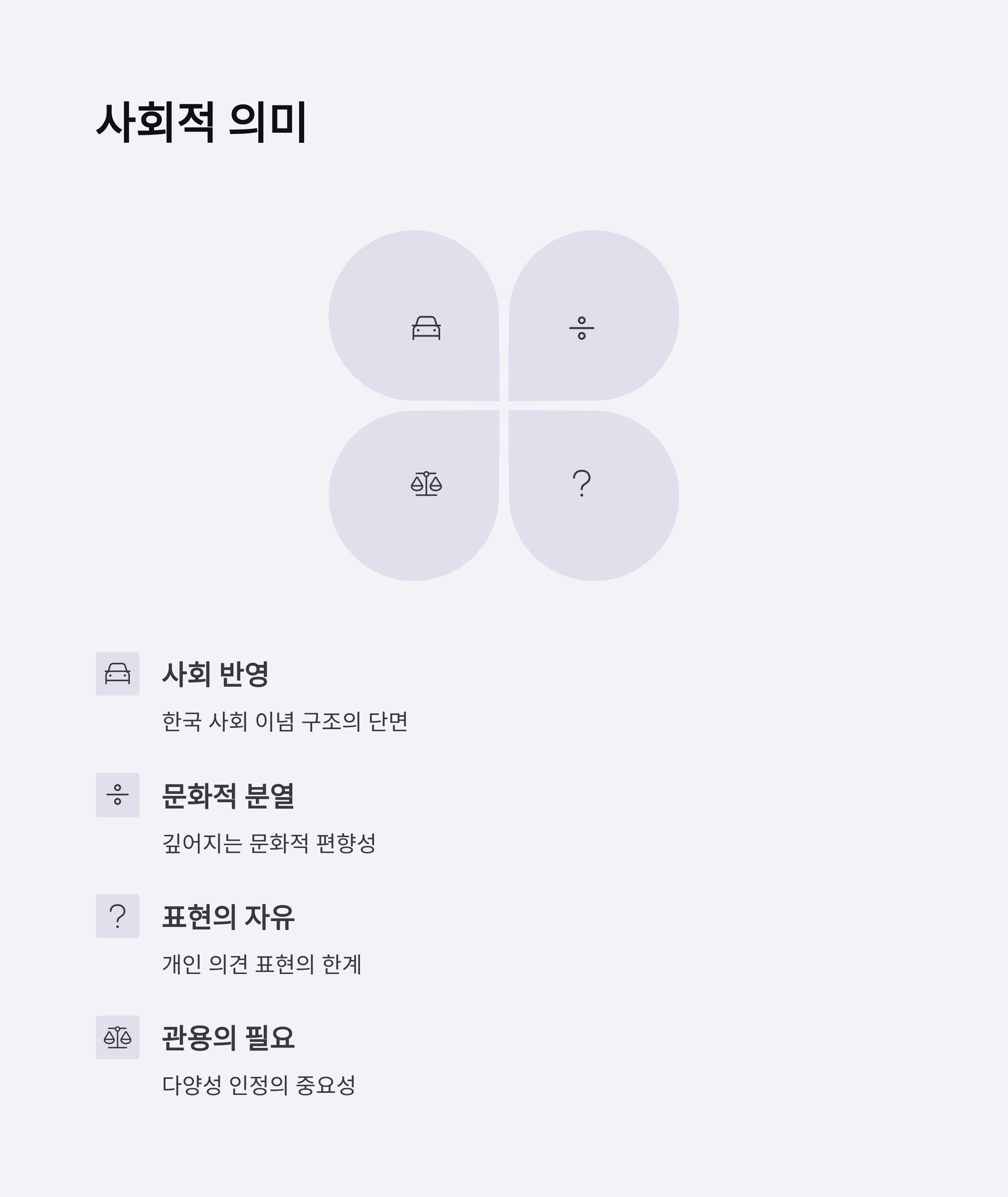- 이렇게 나타난 갈등은 궁극적으로 대한민국 이념 구조와 문화적 편향성을 보여줍니다.