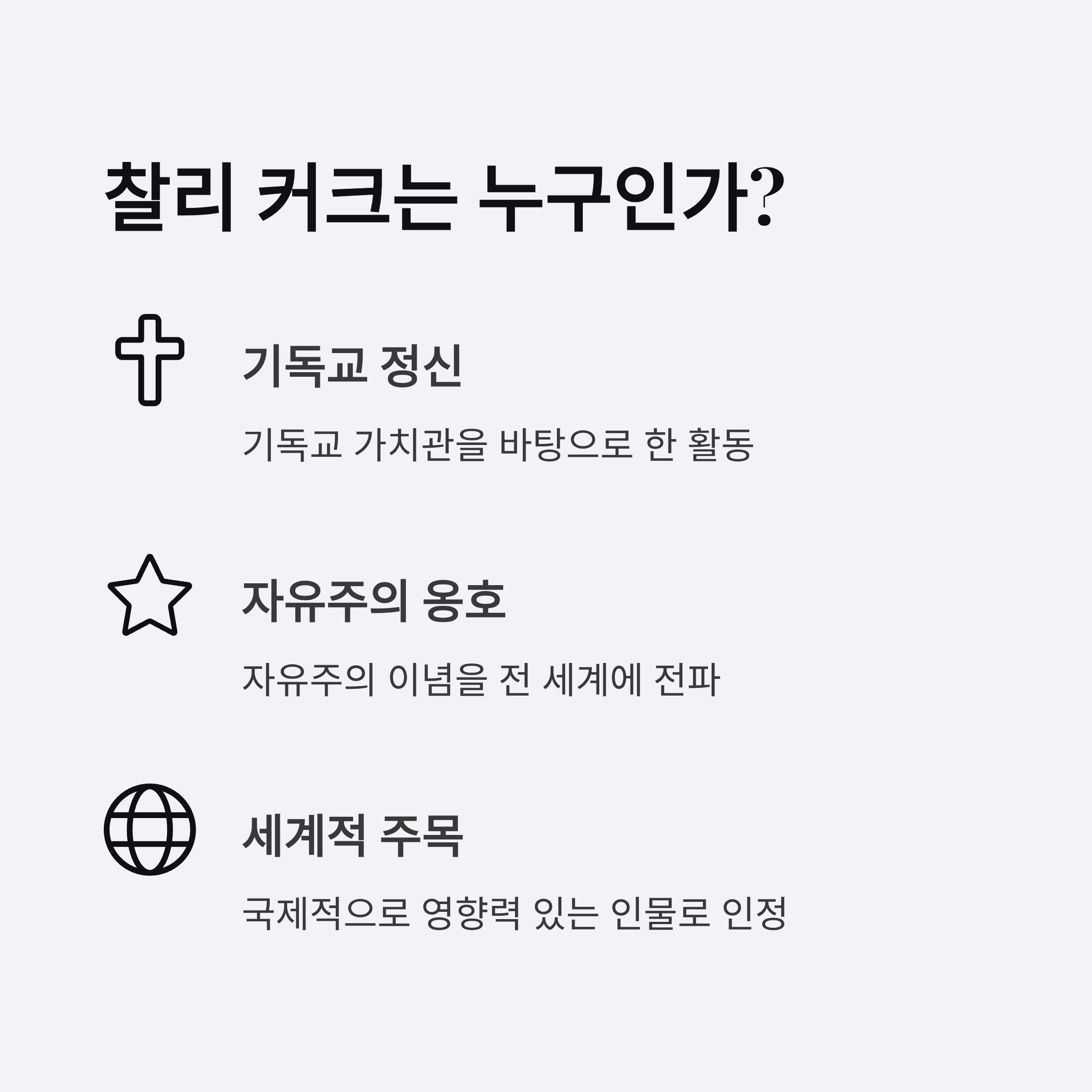 - 찰리 커크는 자유주의와 기독교 정신을 옹호하며 세계적으로 주목받았던 인물입니다.