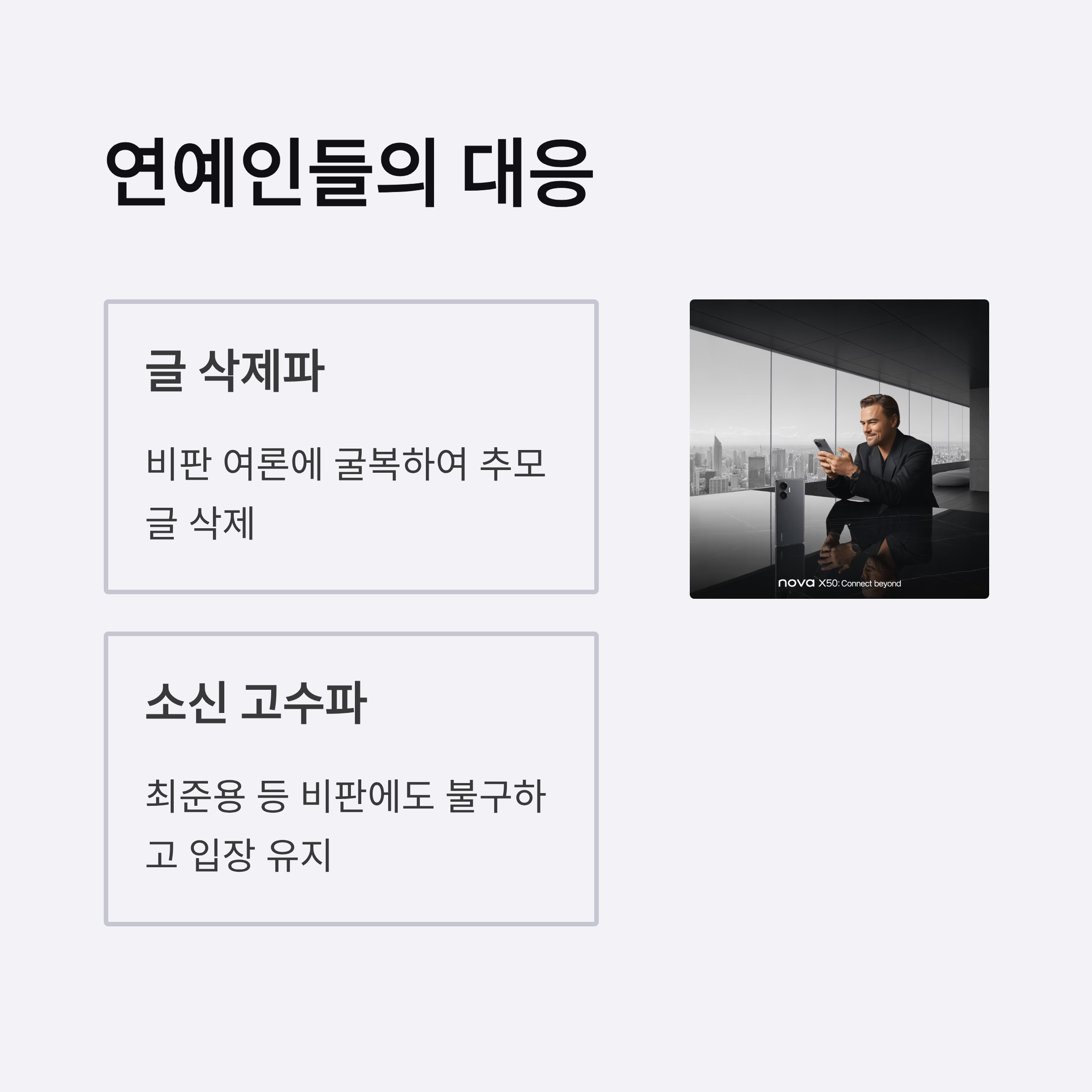 특히 SNS는 이러한 갈등의 무대가 됩니다. 과거 오프라인에서는 비교적 주목받지 못했던 발언이 지금은 온라인 공간을 통해 빠르게 확산되며 특정 이념화된 지지자 그룹으로부터 비판의 대상이 됩니다. 이로 인해, 연예인 스스로 자발적인 자기검열을 하거나, 회사 측의 입장을 따르게 되는 경우가 많습니다.