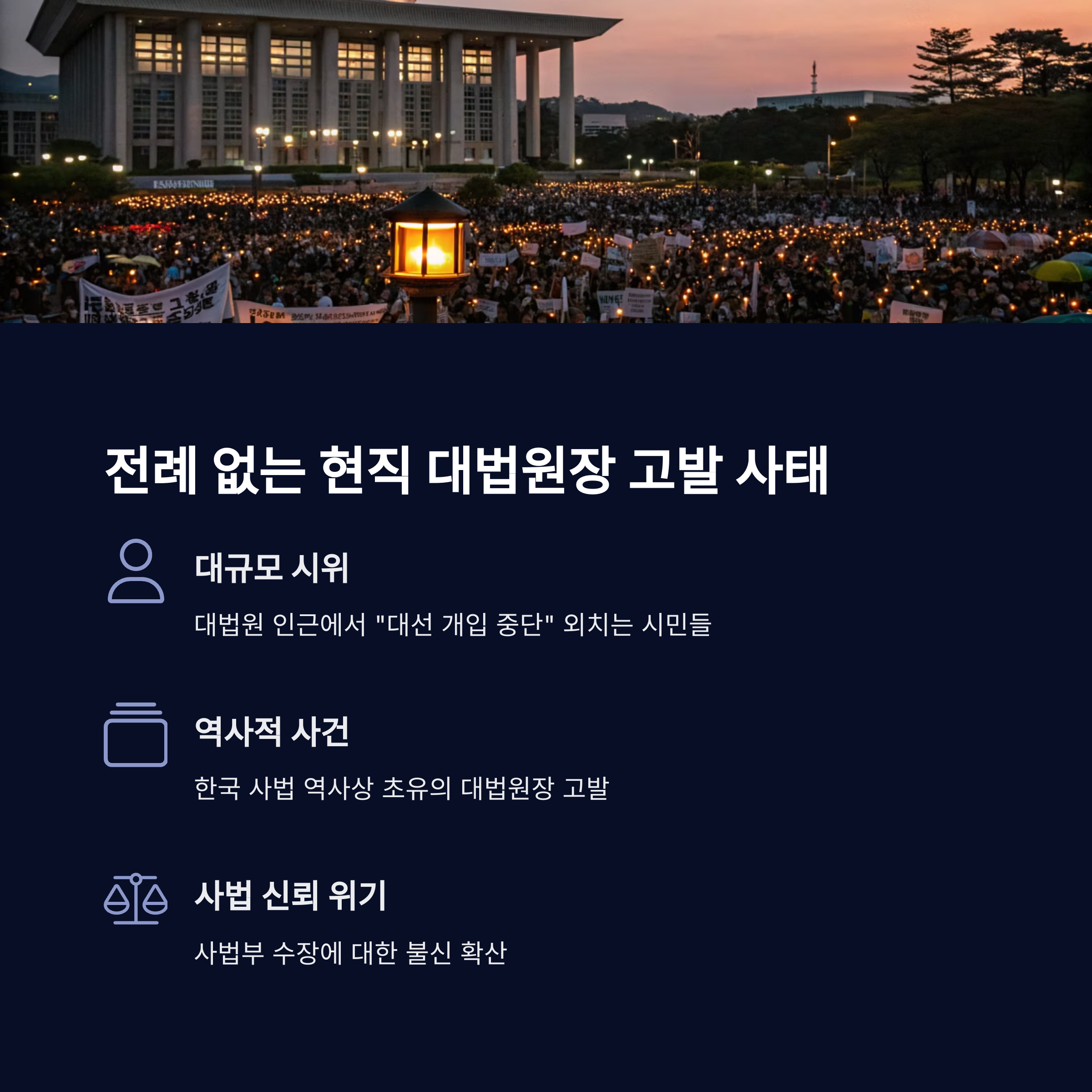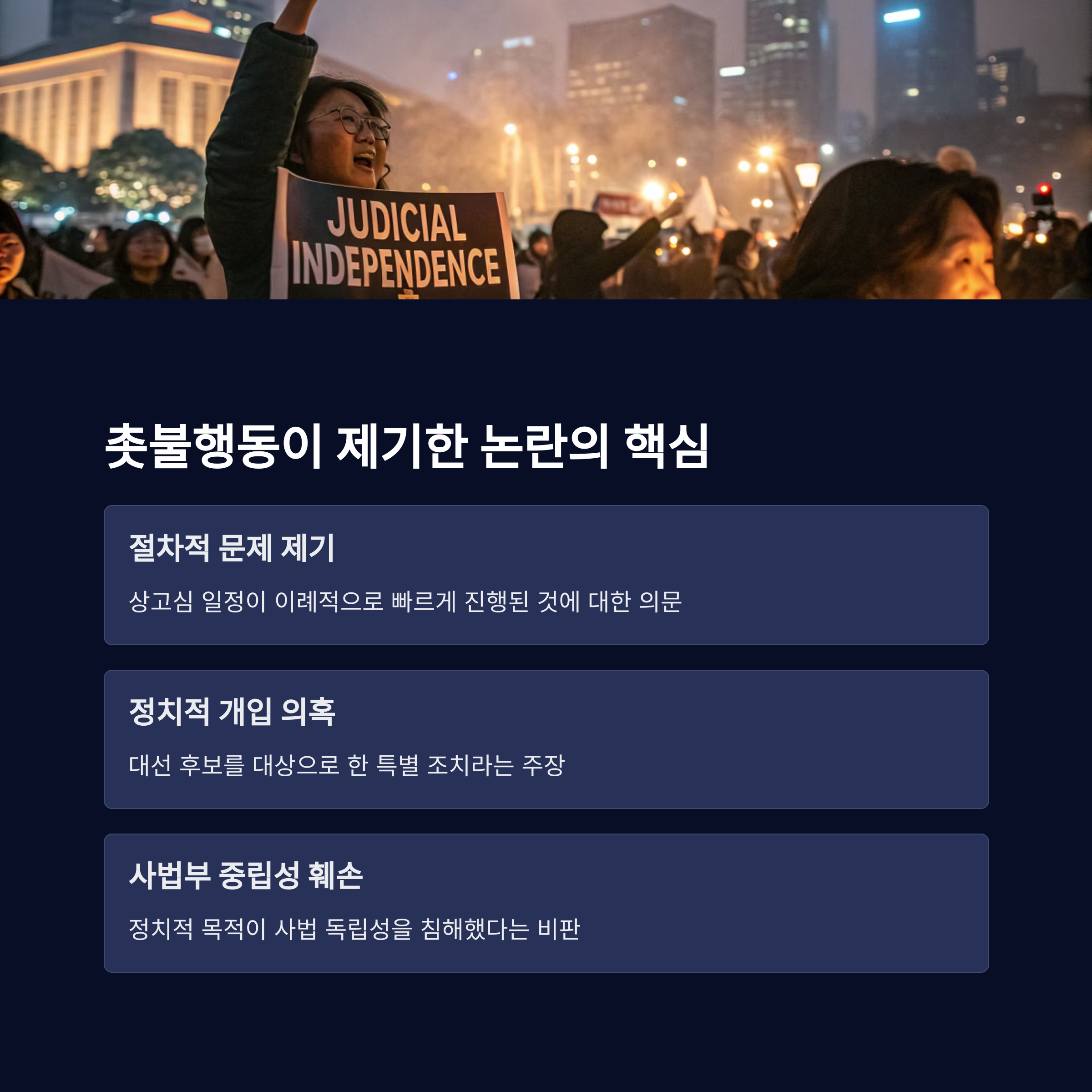 이번 사건은 사법부의 독립성과 정치적 영향력 간의 경계를 다시 한번 조명하게 만들었습니다. 조희대 대법원장과 대법원의 처리 방식은 사법적 공정성의 시험대에 오른 셈입니다. 촛불행동의 고발과 고발 내용은 향후 법정 다툼으로 이어질 가능성이 높으며, 이는 여론과 정치권의 반응에도 상당한 영향을 미칠 것입니다.