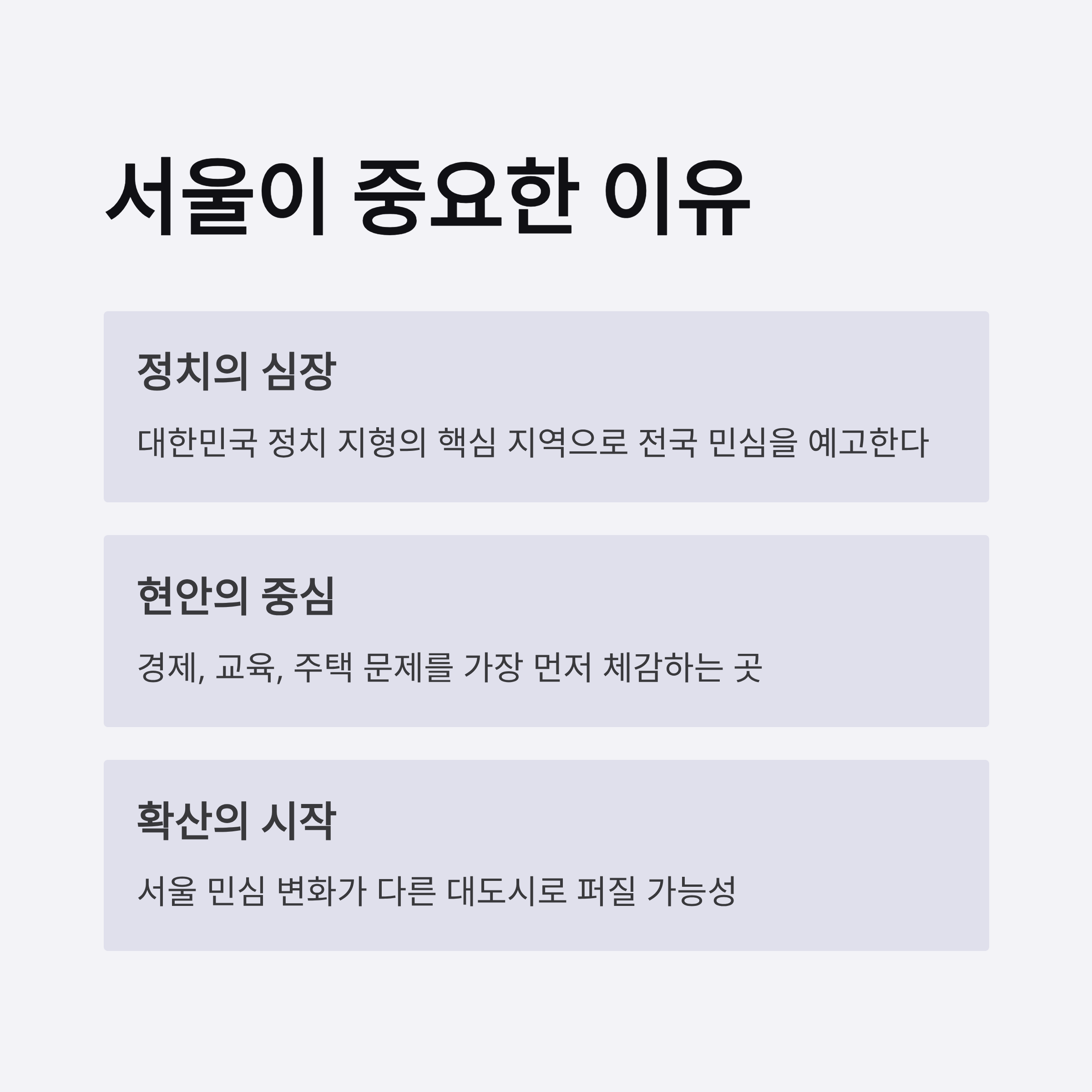 A. 서울 지역은 경제·주거 문제에 민감하며, 여당의 정책 실패가 직접 영향을 미쳤습니다. 야당이 대안을 제시하며 지지율 상승으로 이어지고 있습니다. |