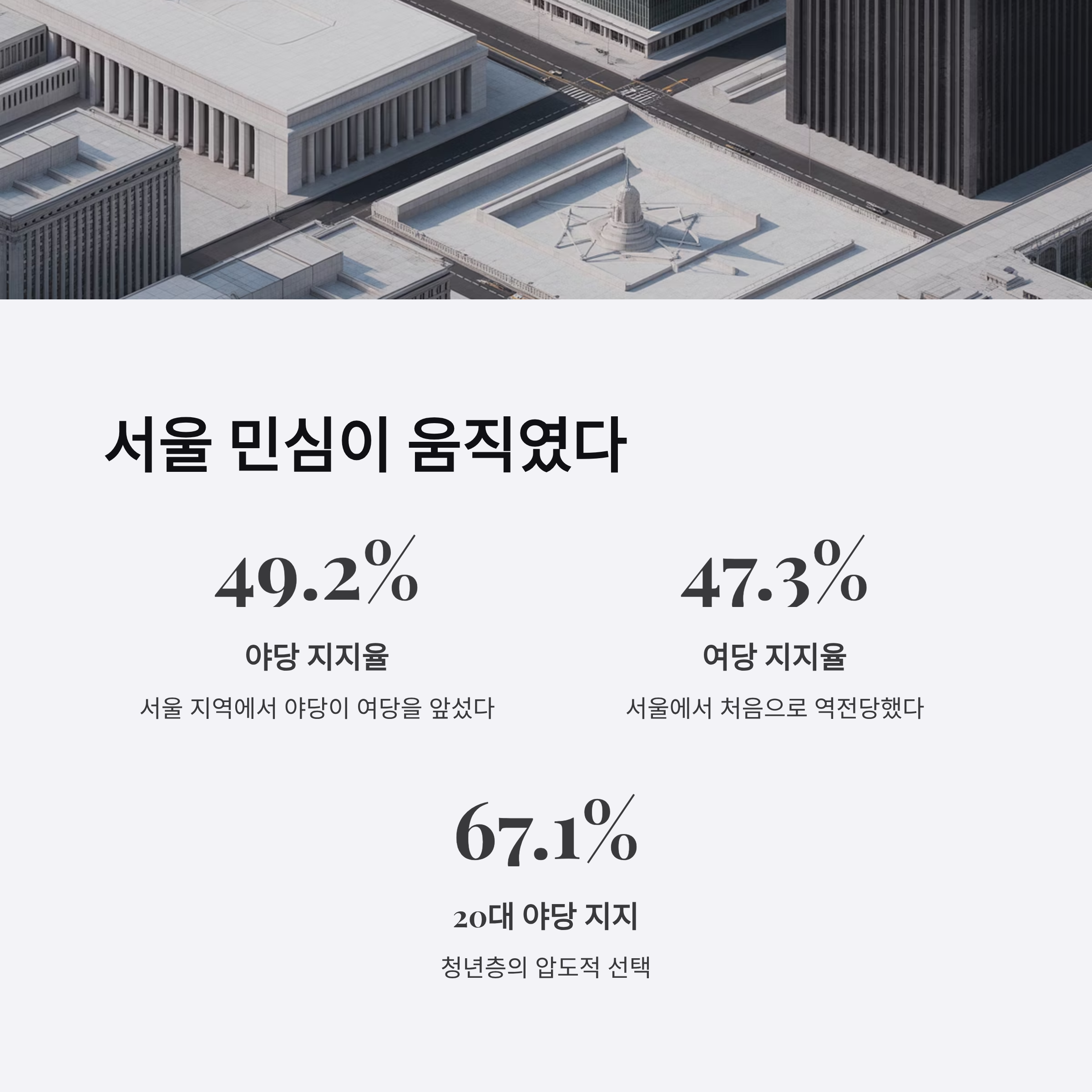 | A. 서울 지역은 경제·주거 문제에 민감하며, 여당의 정책 실패가 직접 영향을 미쳤습니다. 야당이 대안을 제시하며 지지율 상승으로 이어지고 있습니다. |