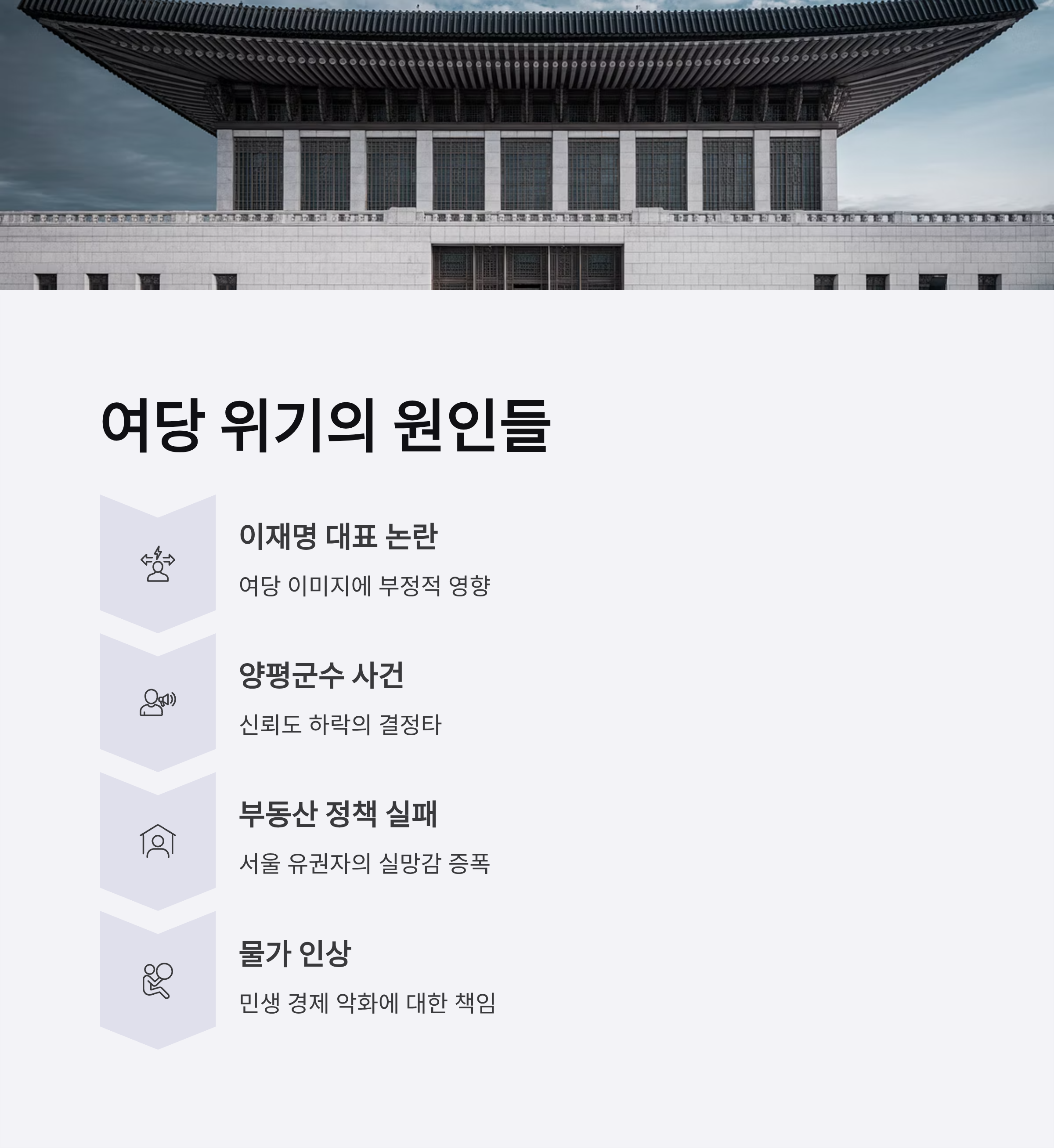 - 이재명 대표 논란 및 양평군수 사건 등이 여당 이미지에 부정적 영향을 미침