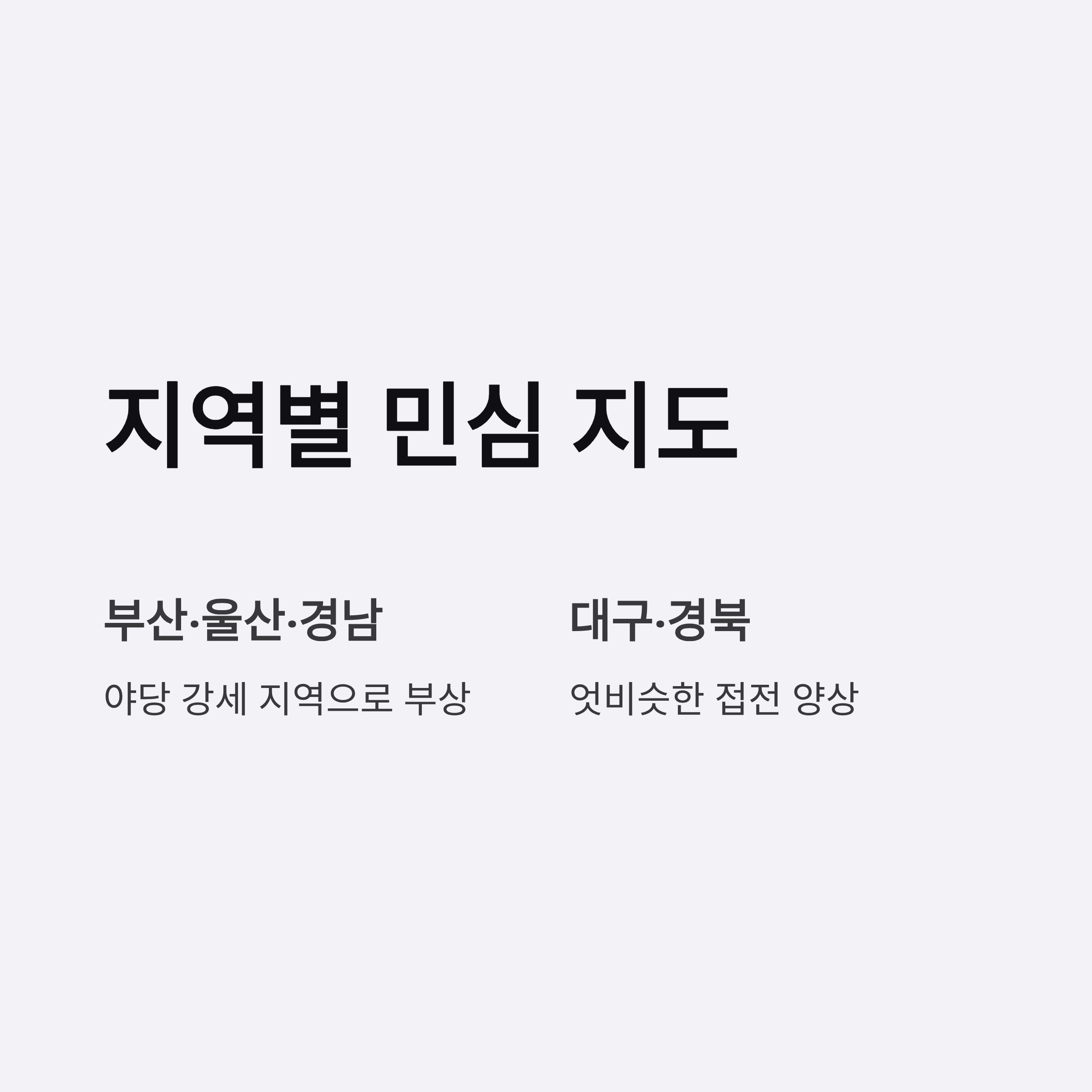 부산·울산·경남(BTK) 지역에서도 야당이 강세를 보이고 있습니다. 이는 대구·경북 지역의 접전 양상과 대조적으로, 특정 정책에 대한 민심이 지역별로 다르게 반응하고 있다는 점을 시사합니다. 특히, 지역 개발 공약의 미이행과 같은 점들이 도심과 농촌 지역 유권자에게 실망을 안겨 준 것으로 보입니다. 야당은 이번 기회를 바탕으로 지방 공략에 적극 나서야 할 것입니다. 반면 여당은 지역 현안에 귀를 기울이고 구체적인 대안을 제시해야 하며, 그렇지 않을 경우 지역 기반까지 흔들릴 위험이 따릅니다.