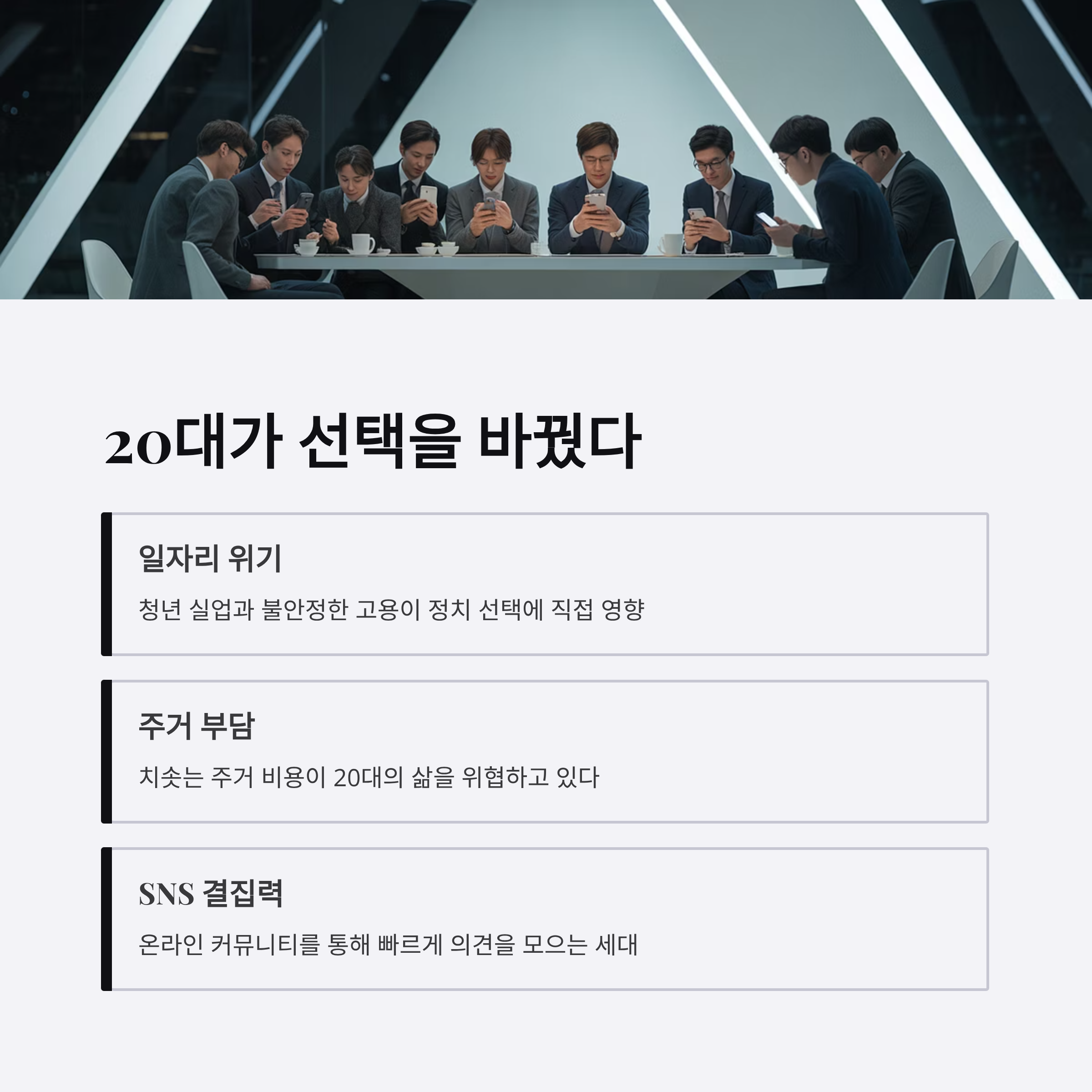 18~29세 유권자, 특히 20대 남성은 여당보다 야당의 지지율이 훨씬 높은 것으로 나타났습니다. 이는 정치권이 기존 세대의 목소리에 집중하며 청년층의 실질적 문제를 간과했던 점이 원인으로 분석됩니다. 20대는 일자리 부족, 주거 비용 증가 등 자신의 삶을 직접적으로 위협하는 문제에 민감하게 반응하는 세대입니다. 추가적으로, 20대는 SNS와 다양한 온라인 커뮤니티를 통해 빠르게 결집하는 속성을 보입니다. 이는 정치적 메시지가 단시간 내에 널리 확산될 가능성을 높이며, 이전 세대와는 다른 정치 움직임을 만들어낼 수 있습니다.