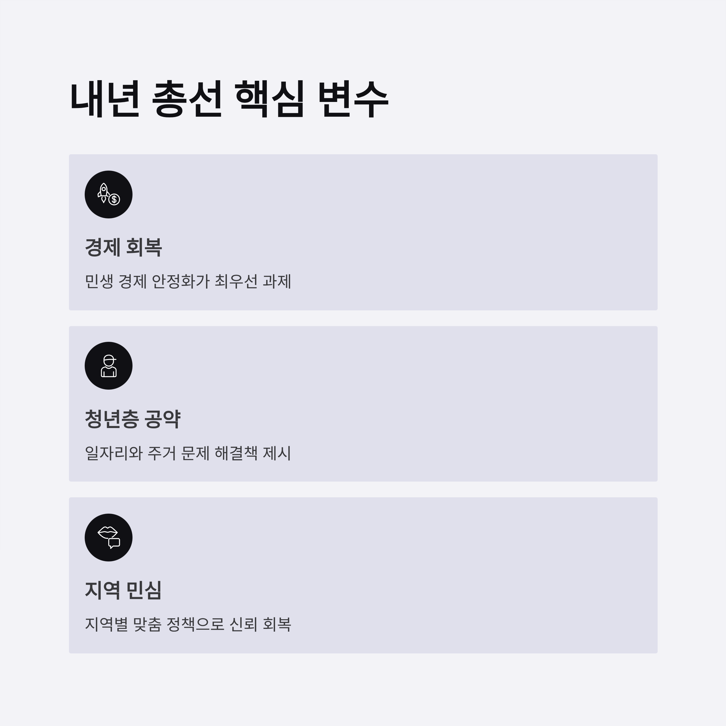 | A. 경제 회복, 청년층 공약, 지역 민심 회복이 중요 변수로 작용할 것입니다. 정치권은 국민 눈높이에 맞는 변화된 행동 양식을 보여야 합니다. |