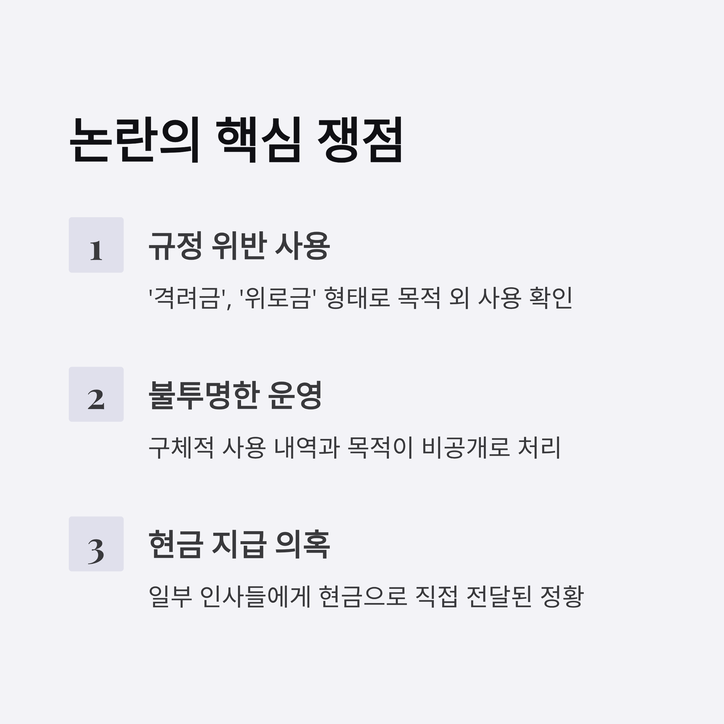 규정된 목적과 달리 사용된 사례는 공공 예산 집행과 사용 명분 부문에서 문제를 일으킬 수 있습니다. 특히 예산의 투명성을 명확히 하지 못할 경우, 자금 유용 사례로 이어질 가능성이 높은 만큼 관리 체계 강화를 요구받을 것으로 보입니다.
