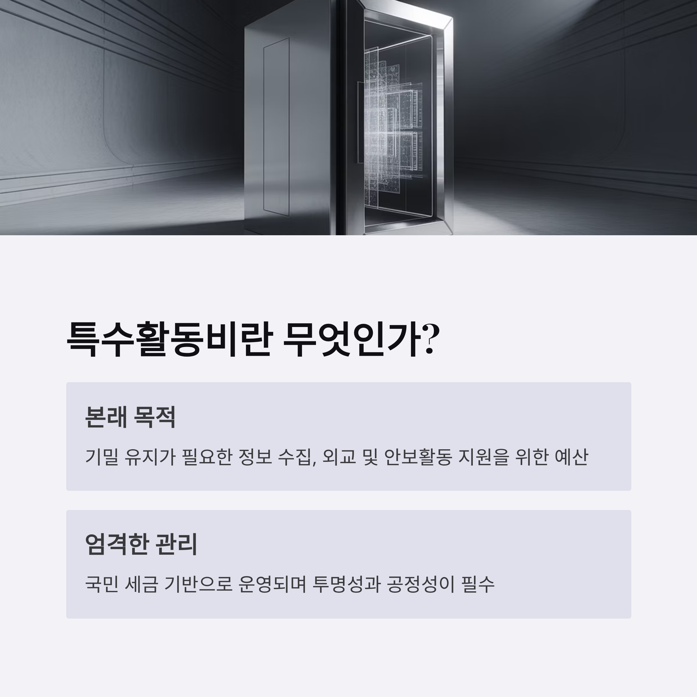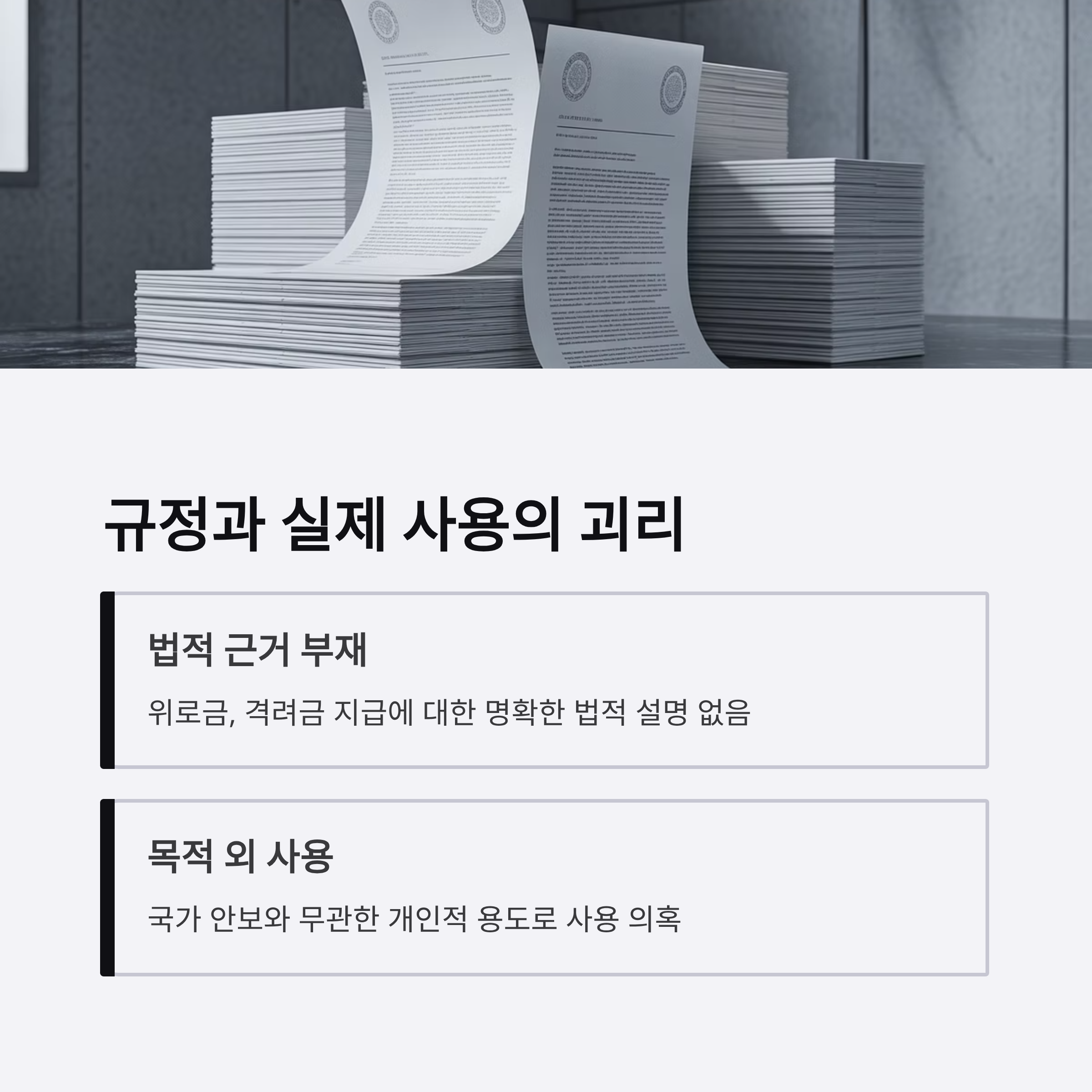 | A. 특활비는 기밀 유지와 국가 안보 목적에 사용되어야 한다는 규정이 있지만, 이번 사건에서는 목적 외 사용 사례와 불투명한 집행 구조가 드러나 논란이 발생했습니다. |
