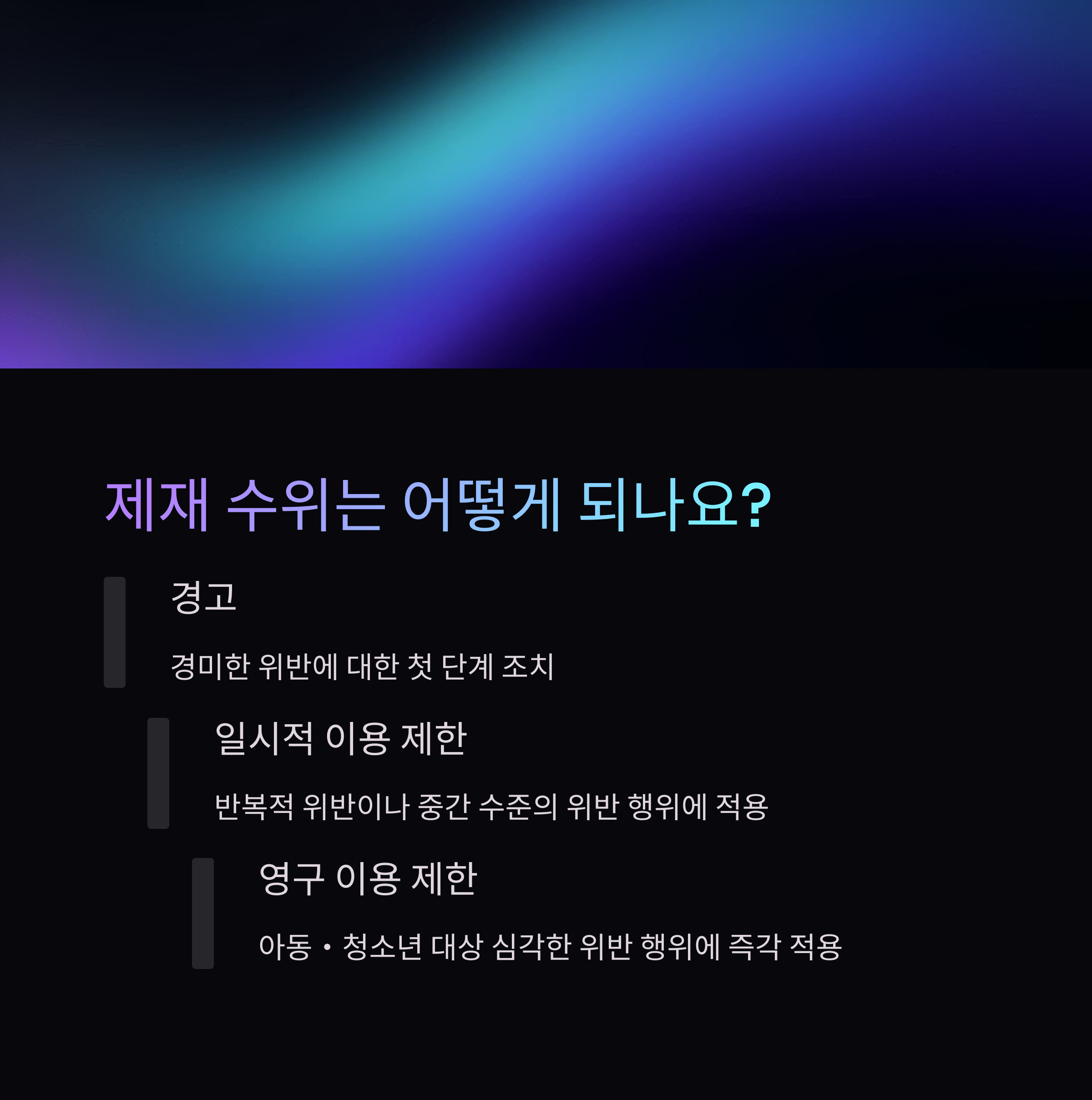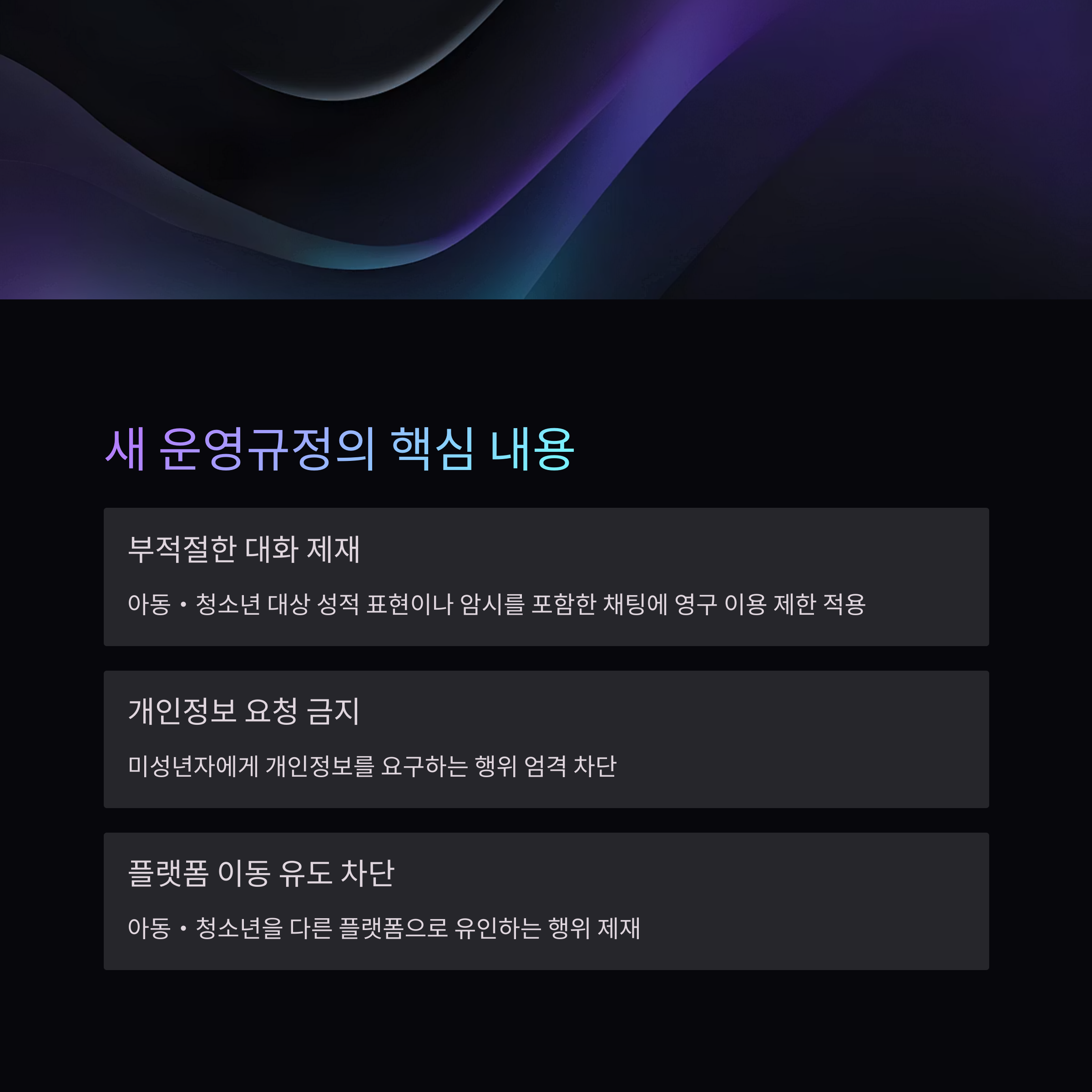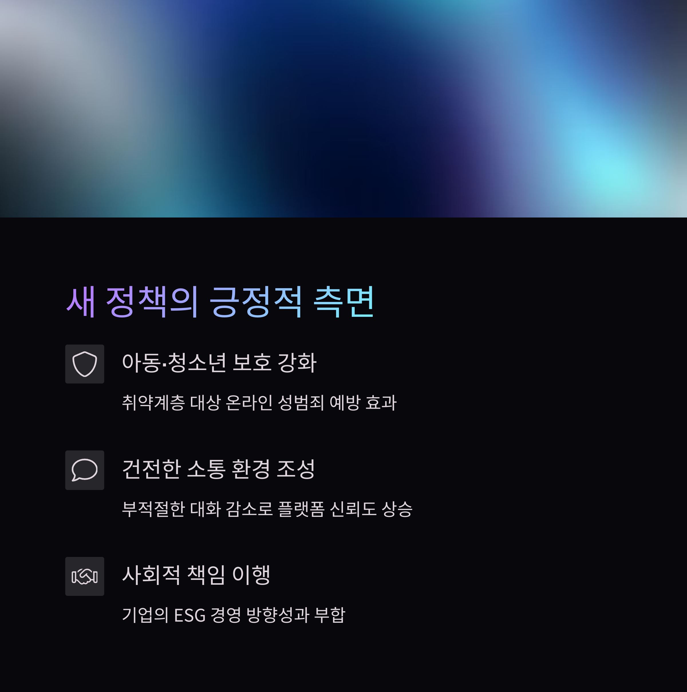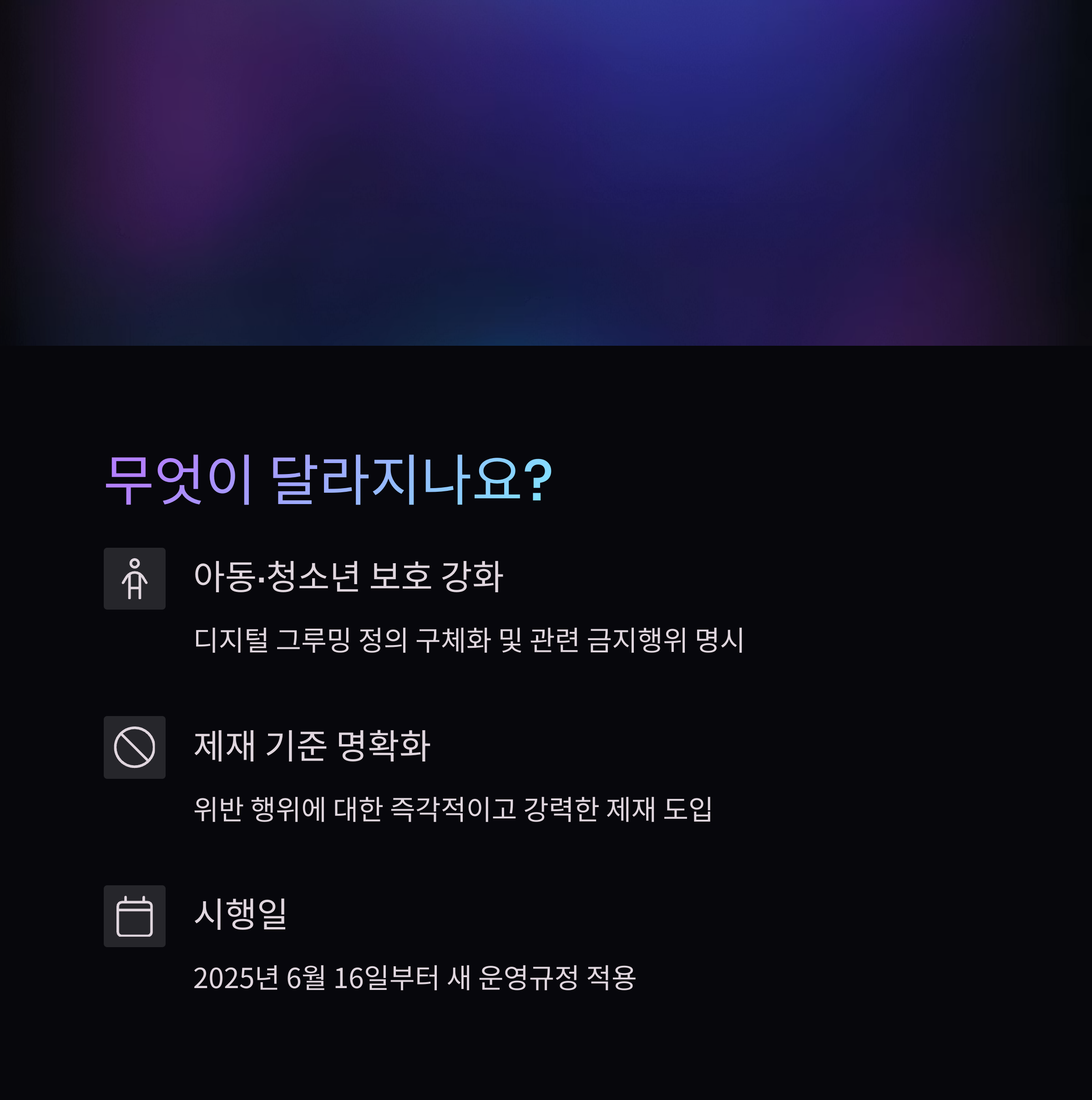 이번 개정안에서는 아동·청소년 대상 성적 표현이나 개인정보 요청, 플랫폼 이동 제안 등의 행위를 즉각적으로 제재할 수 있도록 규정을 고도화했습니다. 특히 영구적인 서비스 제한이라는 강력한 처벌 규정을 도입함으로써 부적절한 행위를 사전에 예방하는 효과가 있을 것으로 보입니다.