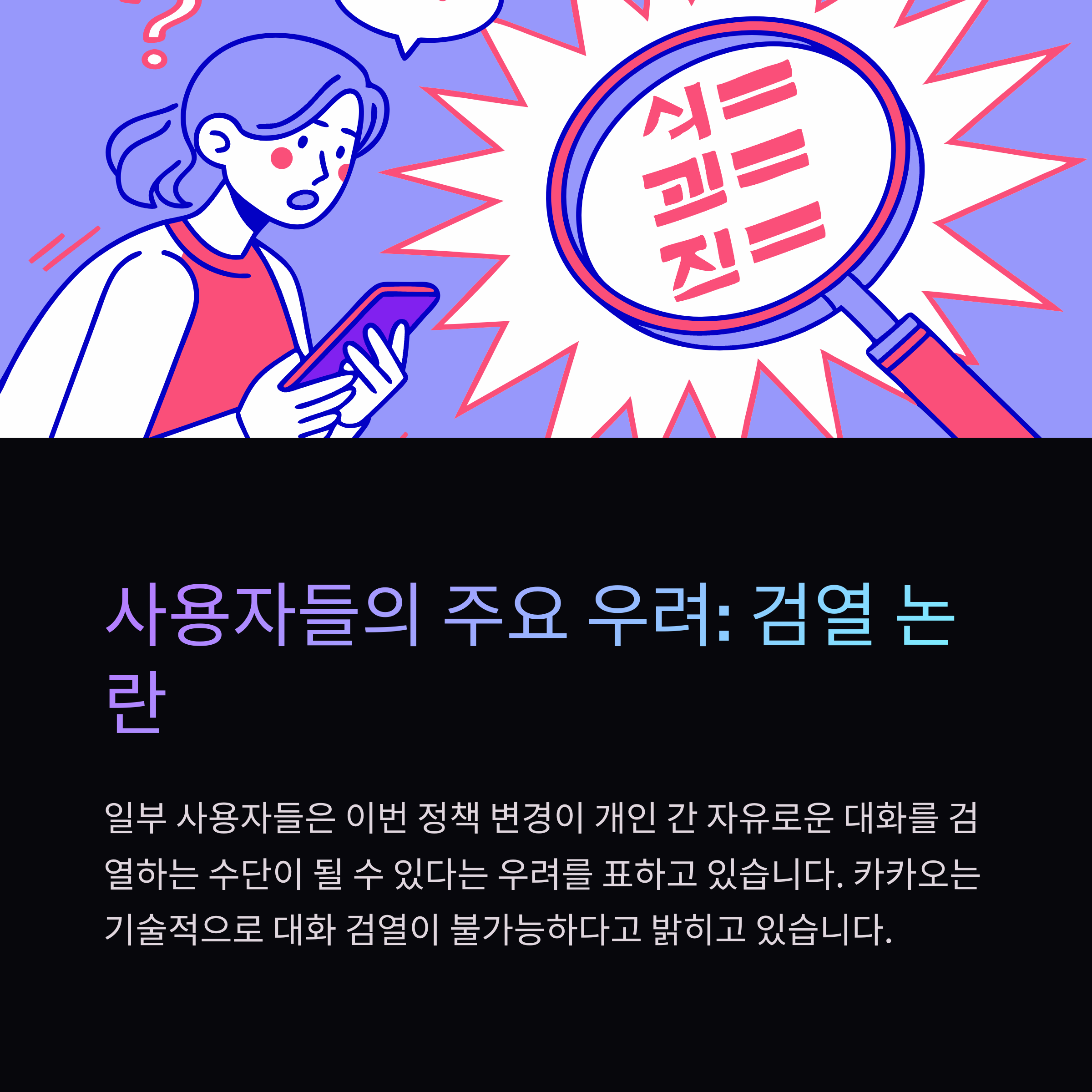 일부 사용자는 운영규정이 강화되면서 개인의 자유로운 의사소통이 검열될 가능성을 우려하고 있습니다. 카카오는 기술적으로 대화 검열은 불가능하다고 밝히고 있지만, 디지털 채팅 기록을 통해 법적 문제 발생 시 자료를 제공할 가능성은 여전히 배제할 수 없습니다. 이로 인해 검열 의혹은 일정 부분 사용자들 사이에서 지속될 전망입니다.