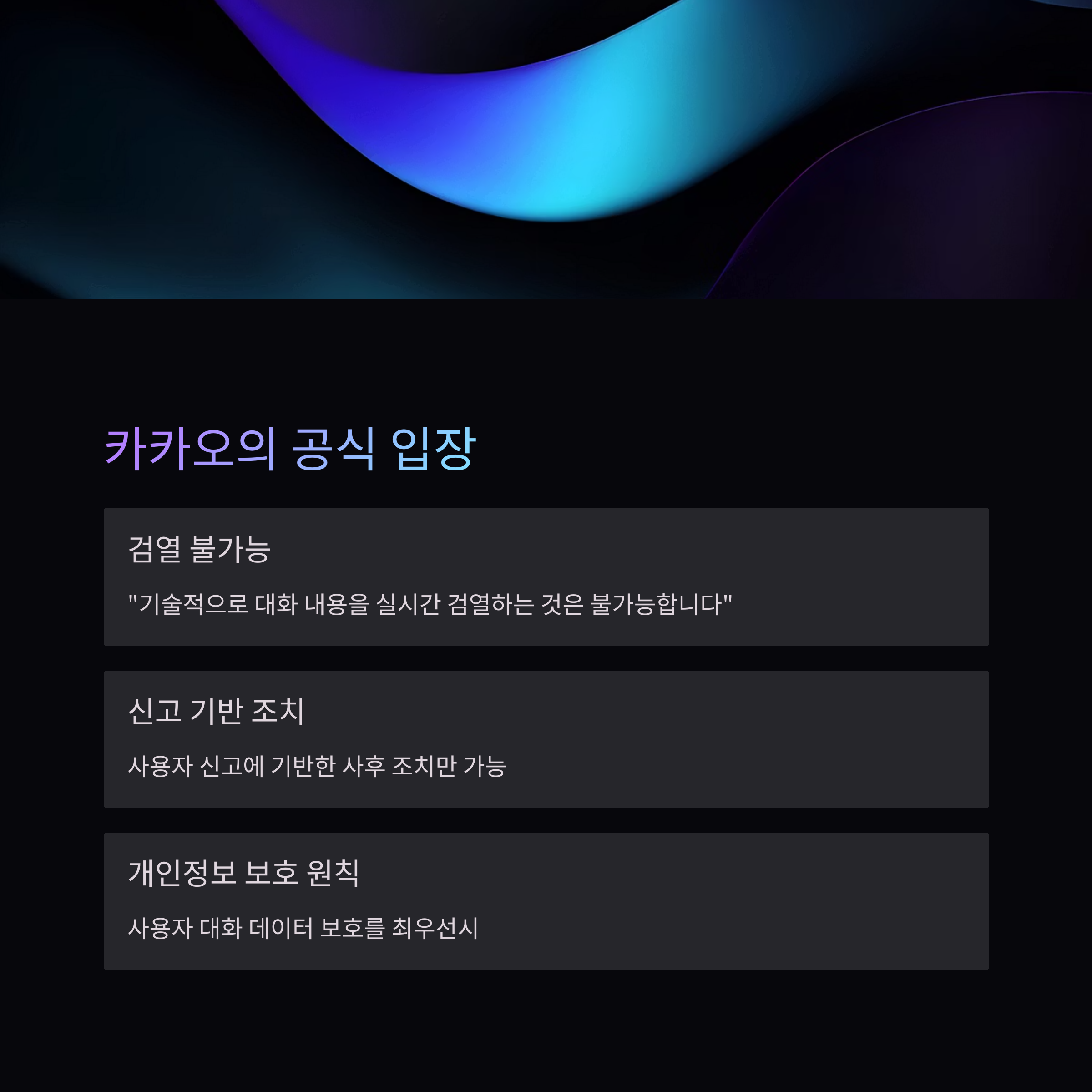 카카오는 사용자의 개인정보를 보호한다는 입장을 고수하며, 대화 검열은 기술적으로 불가능하다고 밝히고 있습니다.