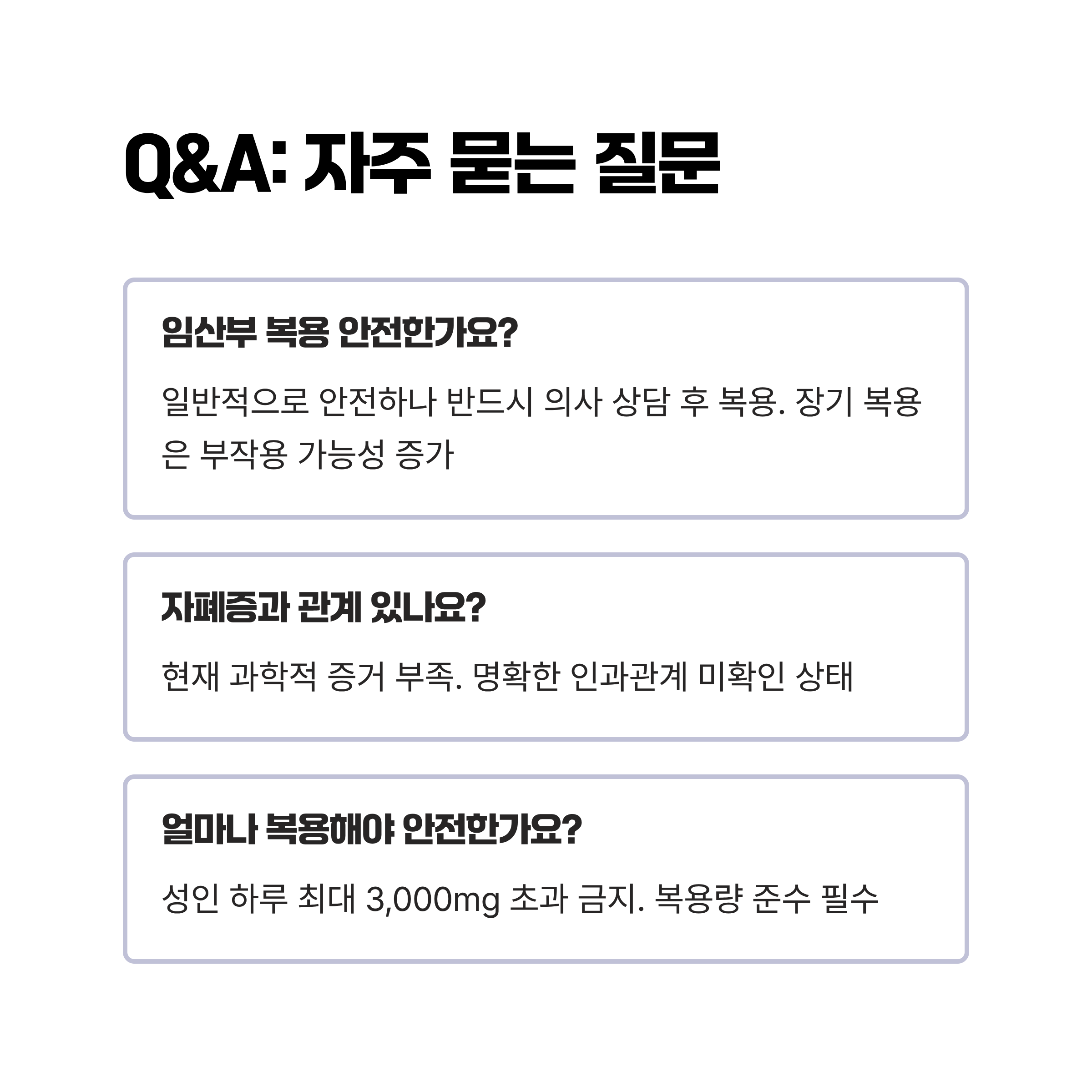 | A. 성인의 경우 하루 최대 3,000mg을 초과하지 않도록 권장됩니다. 정해진 복용량 이상 사용은 간 손상 등의 심각한 부작용을 유발할 수 있습니다. |